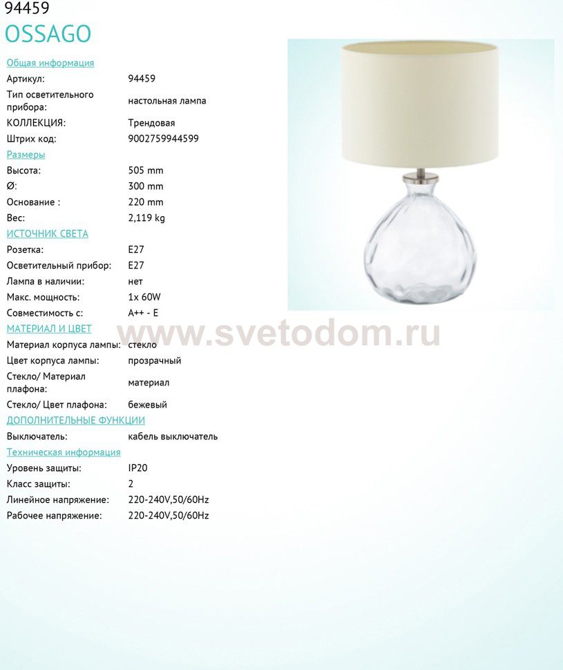 Настольная лампа OSSAGO Комментарий