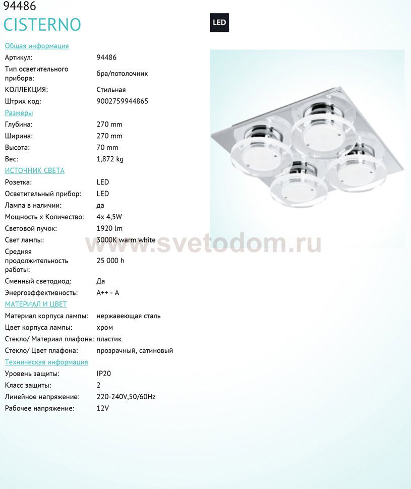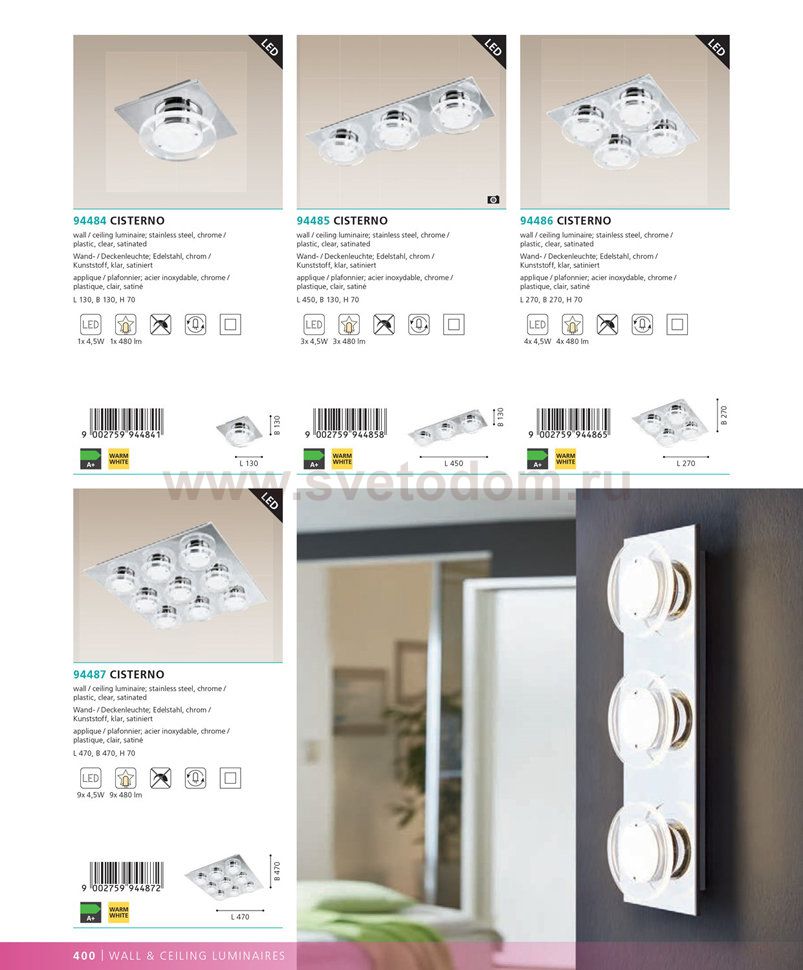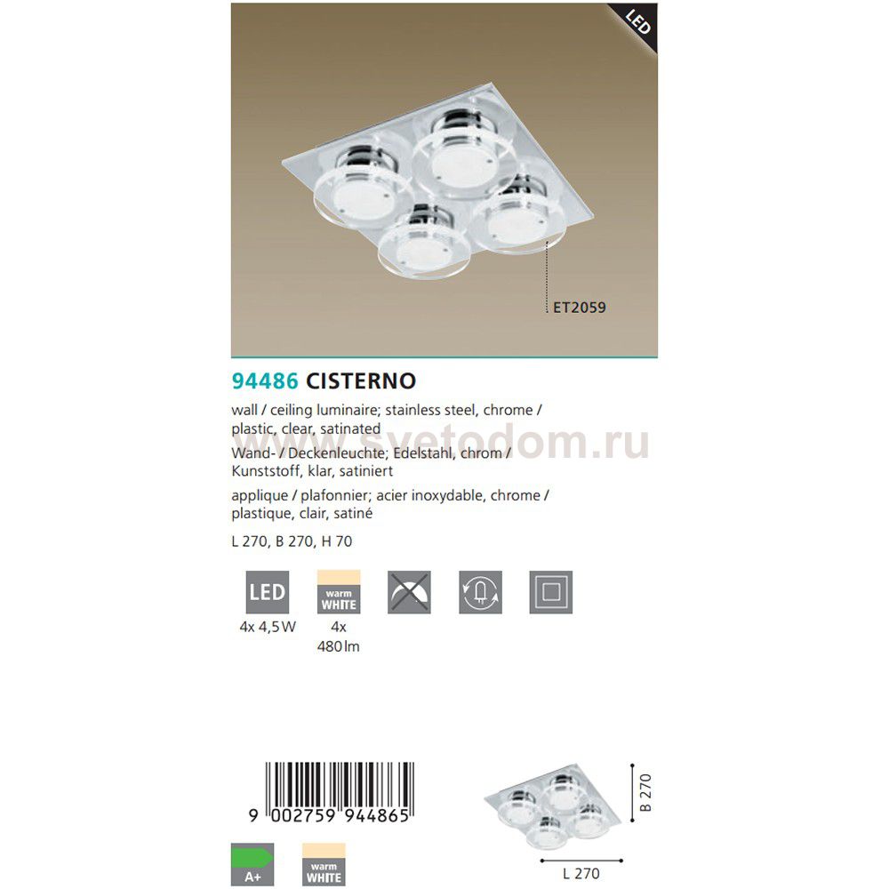 Настенно-потолочные светильники – это универсальные осветительные варианты, которые подходят для вертикального и горизонтального монтажа. В интернет-магазине «Светодом» Вы можете приобрести подобные модели по выгодной стоимости. В нашем каталоге представлены как бюджетные варианты, так и эксклюзивные изделия от производителей, которые уже давно заслужили доверие дизайнеров и простых покупателей. Настенно-потолочный светильник Eglo 94486 станет прекрасным дополнением к основному освещению. Благодаря качественному исполнению и применению современных технологий при производстве эта модель будет радовать Вас своим привлекательным внешним видом долгое время. Приобрести настенно-потолочный светильник Eglo 94486 можно, находясь в любой точке России.