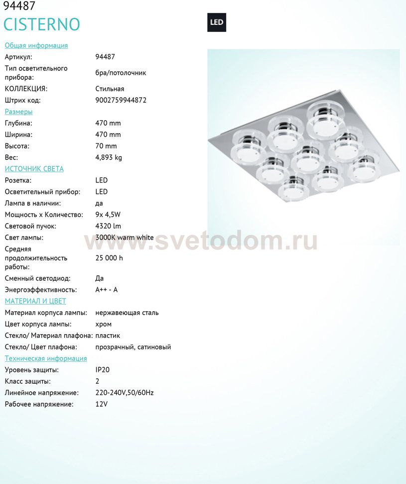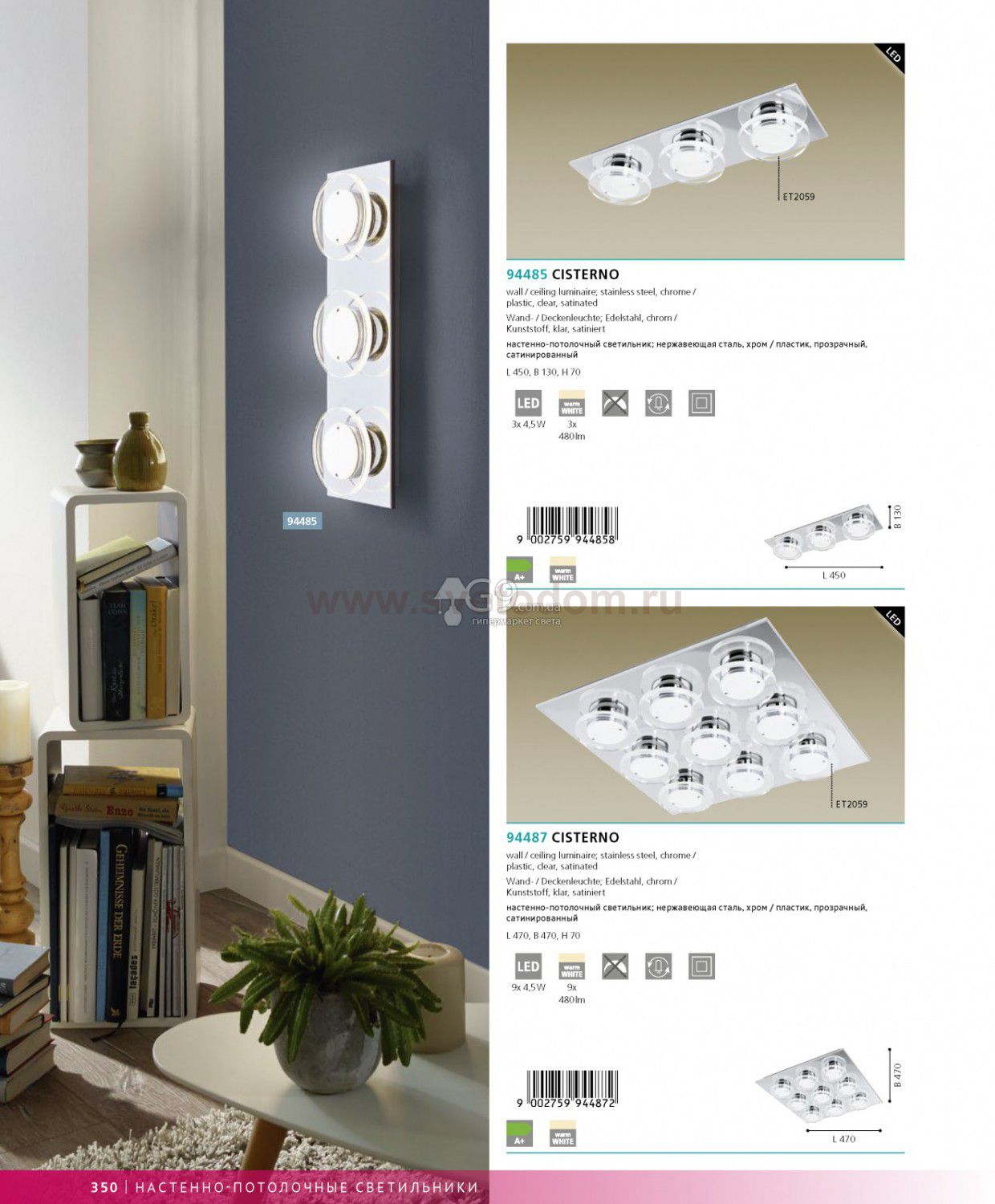 Настенно-потолочные светильники – это универсальные осветительные варианты, которые подходят для вертикального и горизонтального монтажа. В интернет-магазине «Светодом» Вы можете приобрести подобные модели по выгодной стоимости. В нашем каталоге представлены как бюджетные варианты, так и эксклюзивные изделия от производителей, которые уже давно заслужили доверие дизайнеров и простых покупателей. Настенно-потолочный светильник Eglo 94487 станет прекрасным дополнением к основному освещению. Благодаря качественному исполнению и применению современных технологий при производстве эта модель будет радовать Вас своим привлекательным внешним видом долгое время. Приобрести настенно-потолочный светильник Eglo 94487 можно, находясь в любой точке России.