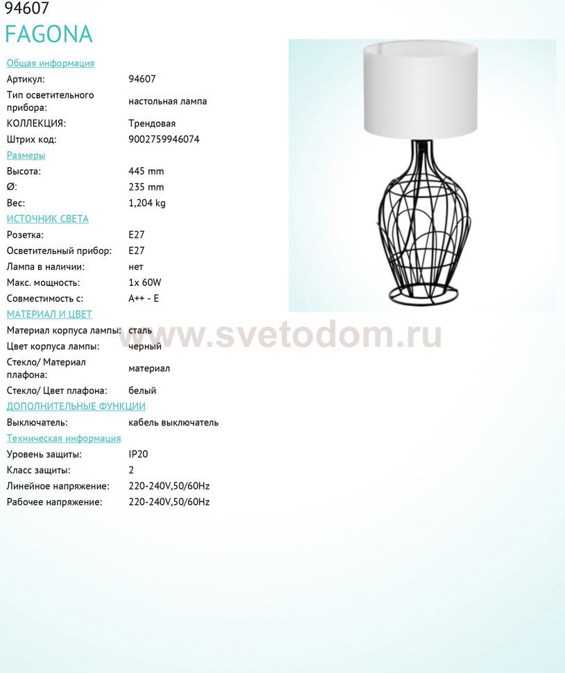 Настольная лампа – это не просто источник дополнительного освещения, но и оригинальный элемент декора. Его можно установить в спальне, гостиной, кабинете и других комнатах. Интернет-магазин «Светодом» предлагает настольные лампы разных стилей по доступным ценам. Благодаря большому ассортименту Вы обязательно найдете в нашем каталоге именно ту модель, которую искали. Настольная лампа Eglo 94607 – прекрасный вариант для завершения интерьера. Ее можно включить одновременно с люстрой для более яркого освещения или без нее для создания уютной атмосферы, настраивающей на отдых. Купить настольную лампу Eglo 94607 Вы можете с помощью виртуальной «Корзины» или по контактным номерам, указанным на сайте.