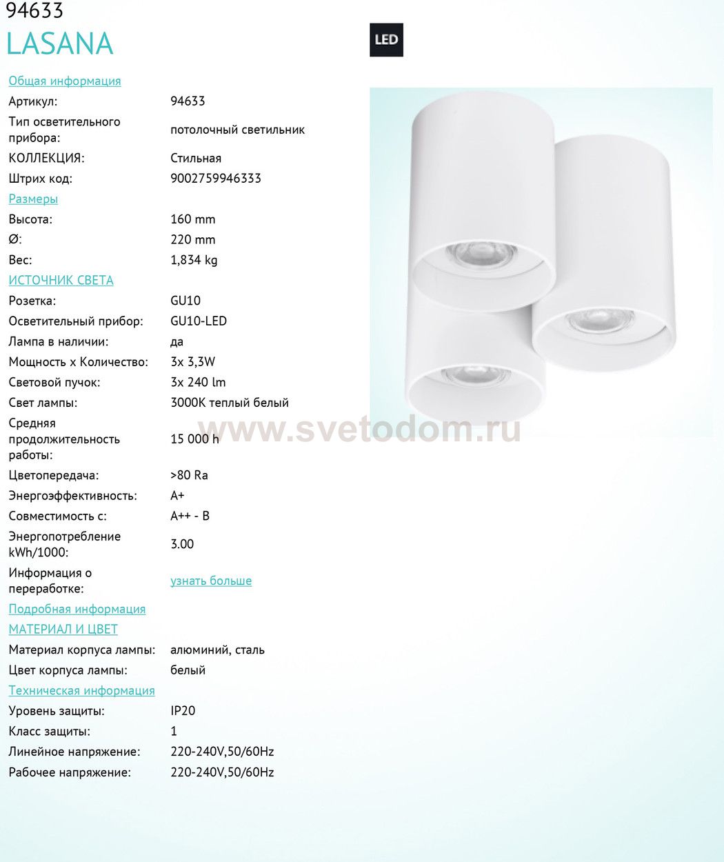 Компания «Светодом» предлагает широкий ассортимент люстр от известных производителей. Представленные в нашем каталоге товары выполнены из современных материалов и обладают отличным качеством. Благодаря широкому ассортименту Вы сможете найти у нас люстру под любой интерьер. Мы предлагаем как классические варианты, так и современные модели, отличающиеся лаконичностью и простотой форм. Стильная люстра Eglo 94633 станет украшением любого дома. Эта модель от известного производителя не оставит равнодушным ценителей красивых и оригинальных предметов интерьера. Люстра Eglo 94633 обеспечит равномерное распределение света по всей комнате. При выборе обратите внимание на характеристики, позволяющие приобрести наиболее подходящую модель. Купить понравившуюся люстру по доступной цене Вы можете в интернет-магазине «Светодом».