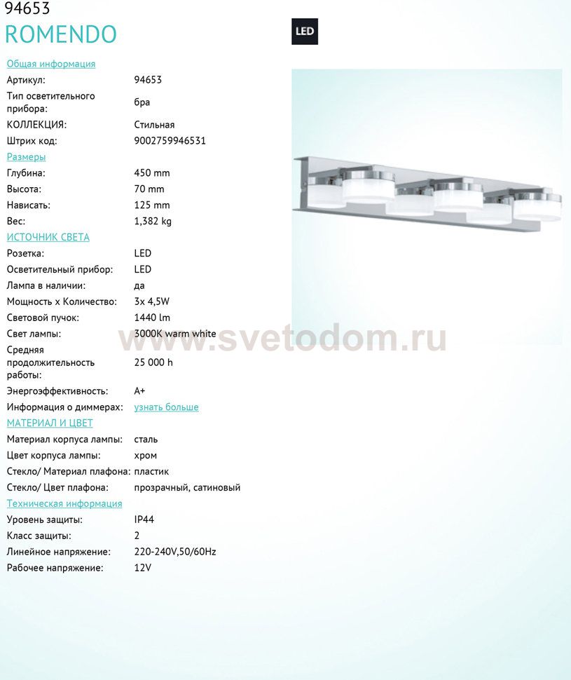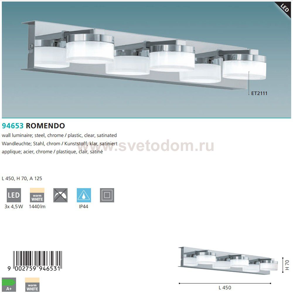 светильник для ванной комнаты и зеркал Eglo 94653 ROMENDO сделает Ваш интерьер современным, стильным и запоминающимся! Наиболее функционально и эстетически привлекательно модель будет смотреться в гостиной, зале, холле или другой комнате. А в комплекте с люстрой и торшером из этой же коллекции сделает интерьер по-дизайнерски профессиональным и законченным.