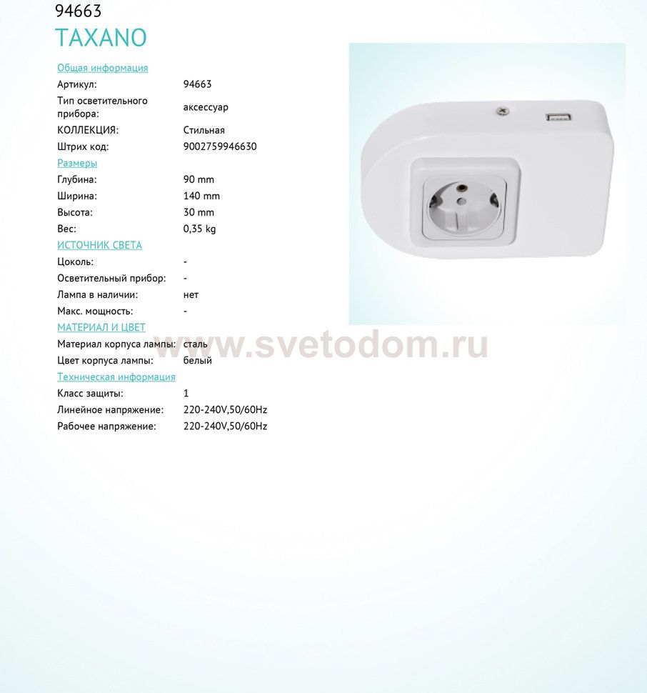 розетка USB Eglo 94663 TAXANO является неотъемлемой частью коллекции, важной электротехнической необходимостью в доме и эстетически красивым элементом в концепции всего дизайна помещения. В одной комнате рекомендовано устанавливать розетки и выключатели одного производителя, серии и оттенка для гармоничного сочетания всей электрики.