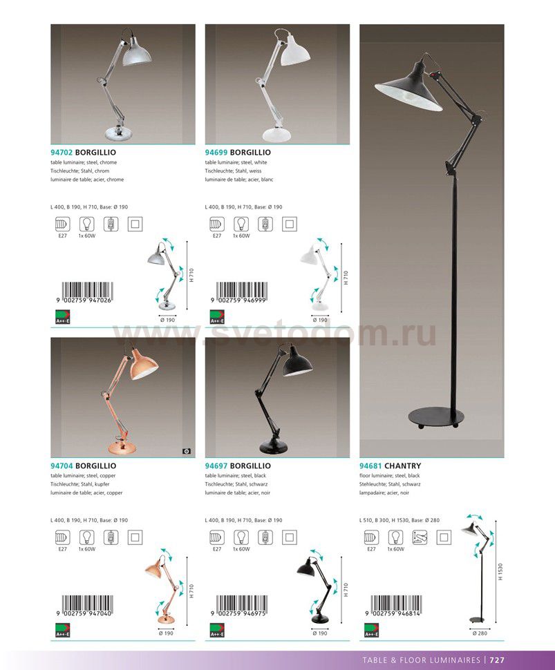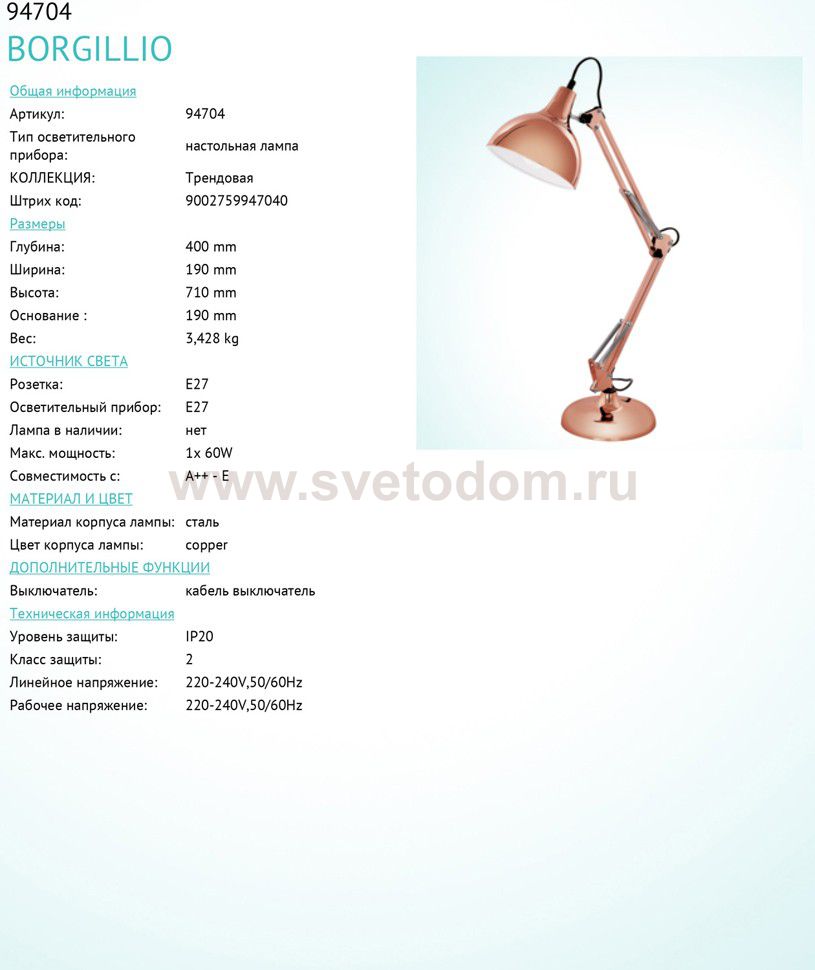 Настольная лампа – это не просто источник дополнительного освещения, но и оригинальный элемент декора. Его можно установить в спальне, гостиной, кабинете и других комнатах. Интернет-магазин «Светодом» предлагает настольные лампы разных стилей по доступным ценам. Благодаря большому ассортименту Вы обязательно найдете в нашем каталоге именно ту модель, которую искали. Настольная лампа Eglo 94704 – прекрасный вариант для завершения интерьера. Ее можно включить одновременно с люстрой для более яркого освещения или без нее для создания уютной атмосферы, настраивающей на отдых. Купить настольную лампу Eglo 94704 Вы можете с помощью виртуальной «Корзины» или по контактным номерам, указанным на сайте.