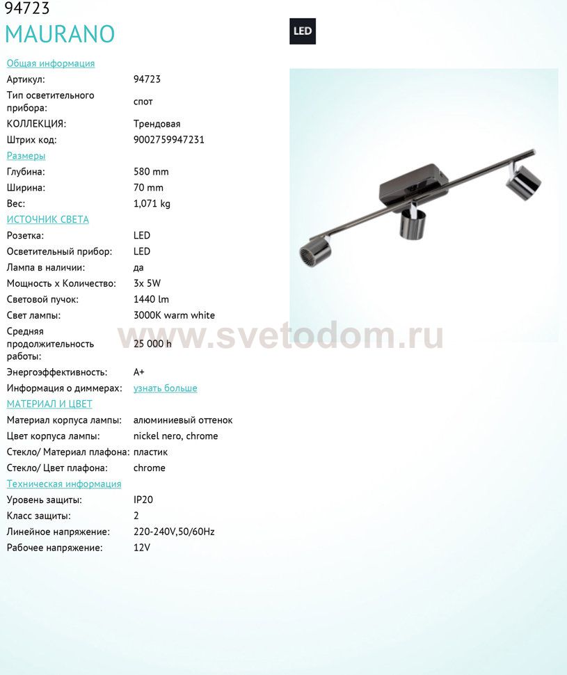 Светильники-споты – это оригинальные изделия с современным дизайном. Они позволяют не ограничивать свою фантазию при выборе освещения для интерьера. Такие модели обеспечивают достаточно качественный свет. Благодаря компактным размерам Вы можете использовать несколько спотов для одного помещения. Интернет-магазин «Светодом» предлагает необычный светильник-спот Eglo 94723 по привлекательной цене. Эта модель станет отличным дополнением к люстре, выполненной в том же стиле. Перед оформлением заказа изучите характеристики изделия. Купить светильник-спот Eglo 94723 в нашем онлайн-магазине Вы можете либо с помощью формы на сайте, либо по указанным выше телефонам. Обратите внимание, что у нас склады не только в Москве и Екатеринбурге, но и других городах России.