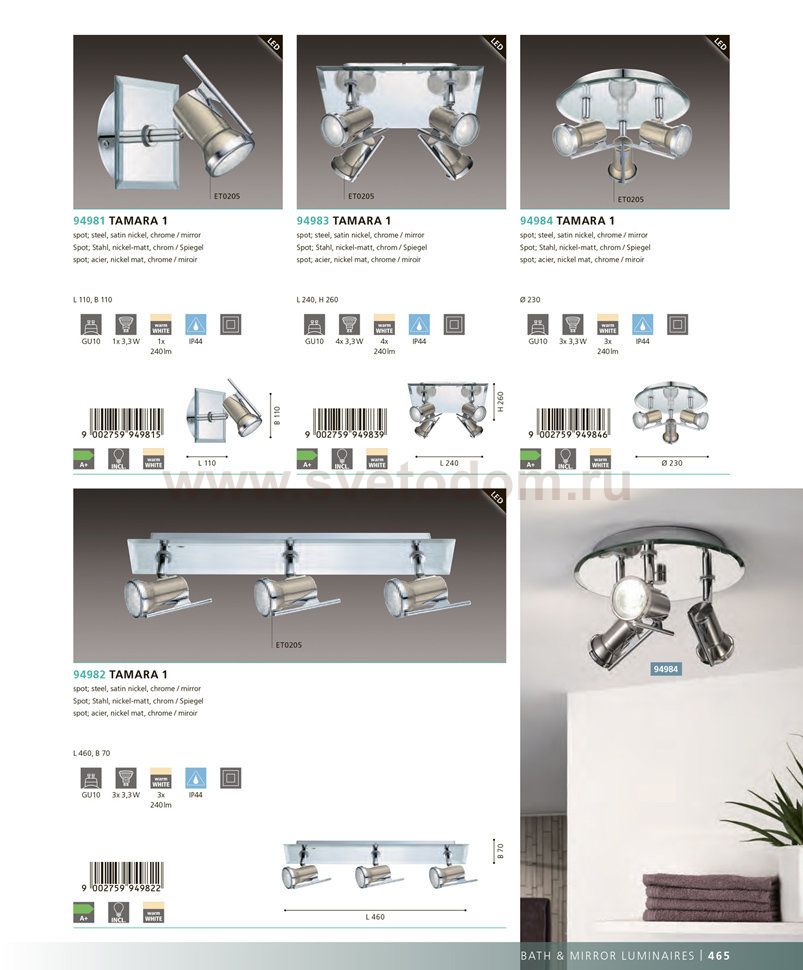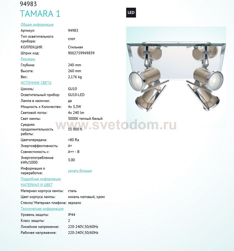 Светодиодный спот TAMARA 1, 4x3,3W (GU10), IP44, сталь, никель матовый, хром/зеркало применяется преимущественно в домашнем освещении с использованием стандартных выключателей и переключателей для сетей 220V.