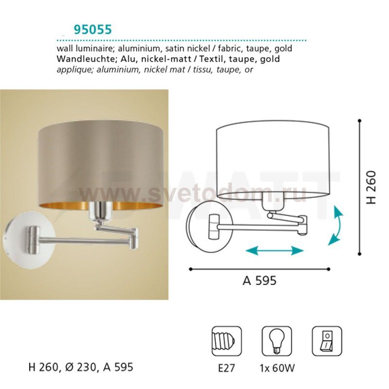 Бра MASERLO коленчатое, 1х60W (E27), ?230, H260, A595, никель матовый/текстиль, серо-коричневый, золотой применяется преимущественно в домашнем освещении с использованием стандартных выключателей и переключателей для сетей 220V.