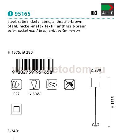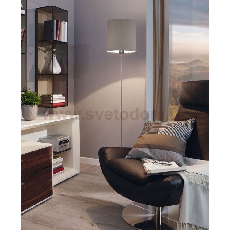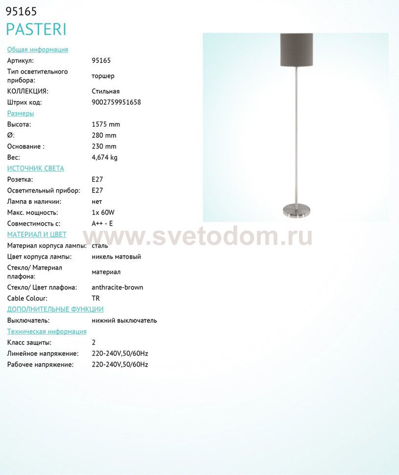 Торшер PASTERI, 1х60W (E27), ?280, H1575, никель матовый/текстиль, антрацит-коричневый применяется преимущественно в домашнем освещении с использованием стандартных выключателей и переключателей для сетей 220V.