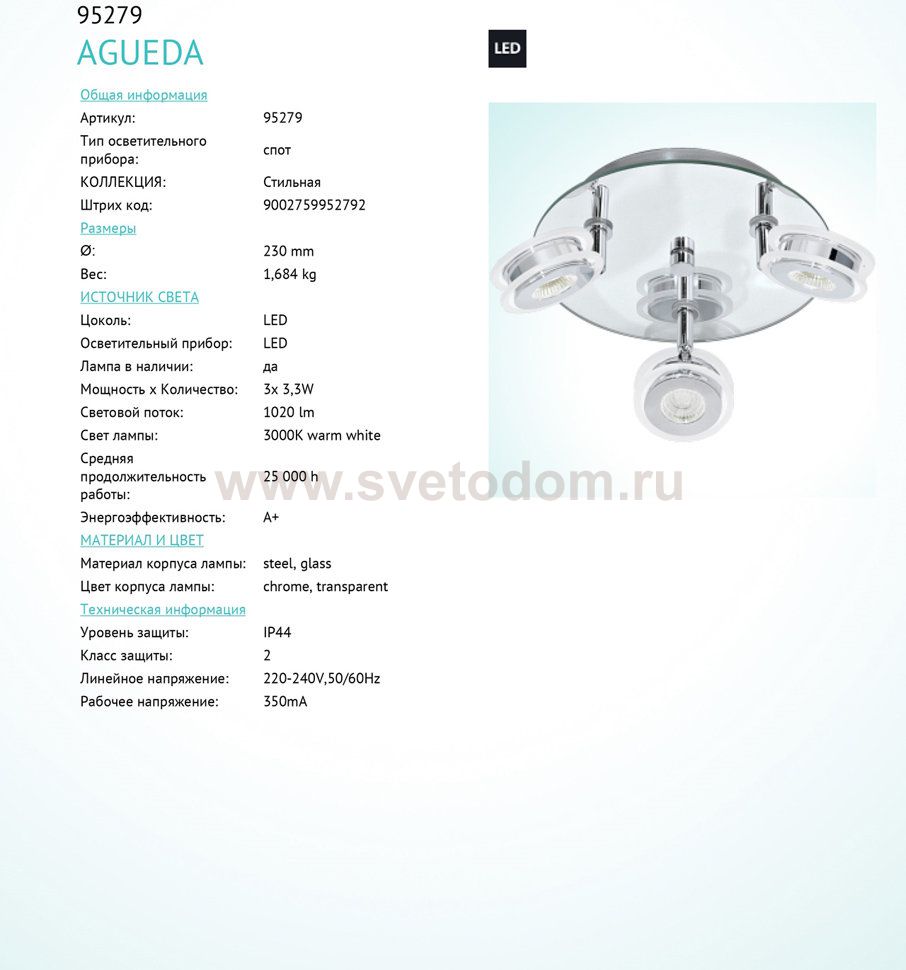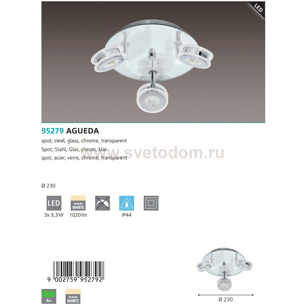 Светодиодный спот AGUEDA, 3х3,3W (LED), ?230, IP44, cталь, стекло, хром, прозрачный применяется преимущественно в домашнем освещении с использованием стандартных выключателей и переключателей для сетей 220V.