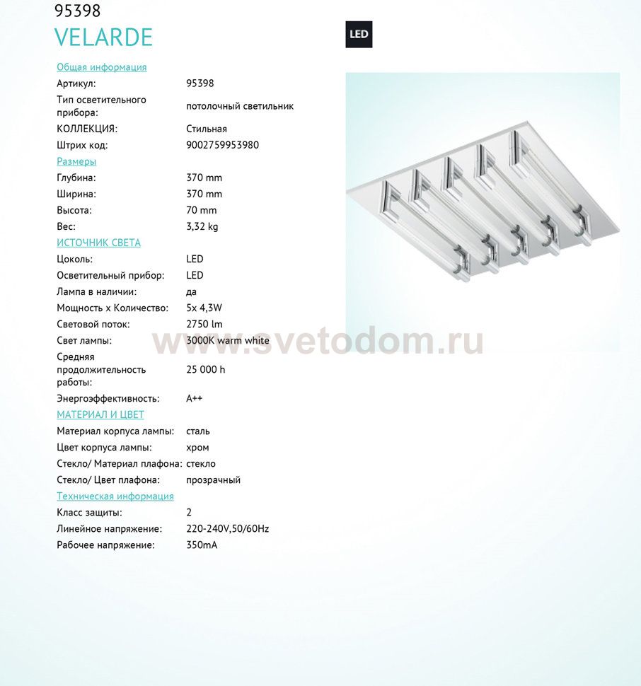 Светодиодный потолочный светильник VELARDE, 5х4,3W(LED), 370х370, сталь, хром/cтекло, прозрачный применяется преимущественно в домашнем освещении с использованием стандартных выключателей и переключателей для сетей 220V.