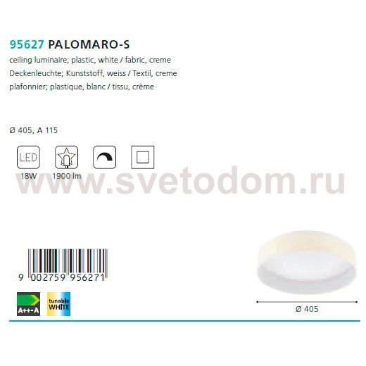 Светодиодный потол. светильник PALOMARO-S Умное освещ.,18W(LED), ?405, пластик, белый/текстиль, кремовый применяется преимущественно в домашнем освещении с использованием стандартных выключателей и переключателей для сетей 220V.