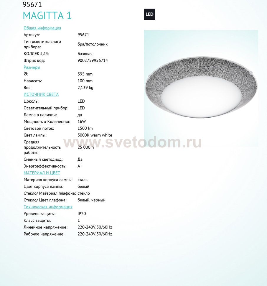 Светодиодный настенно-потолочный светильник MAGITTA 1, 16W(LED), ?395, сталь, белый/стекло, белый, черный применяется преимущественно в домашнем освещении с использованием стандартных выключателей и переключателей для сетей 220V.