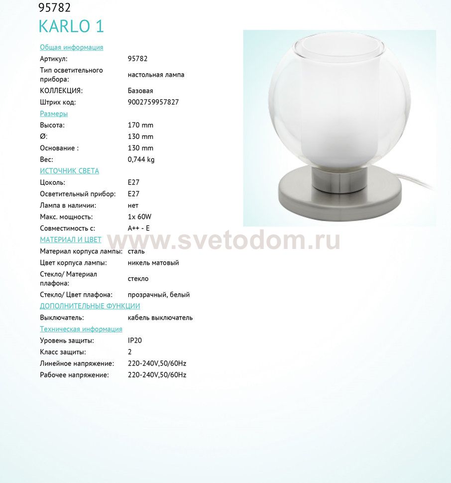 Наст. лампа KARLO 1, 1х60W(E27), ?130, H170, сталь, никель матовый/ стекло, прозрачный, белый применяется преимущественно в домашнем освещении с использованием стандартных выключателей и переключателей для сетей 220V.