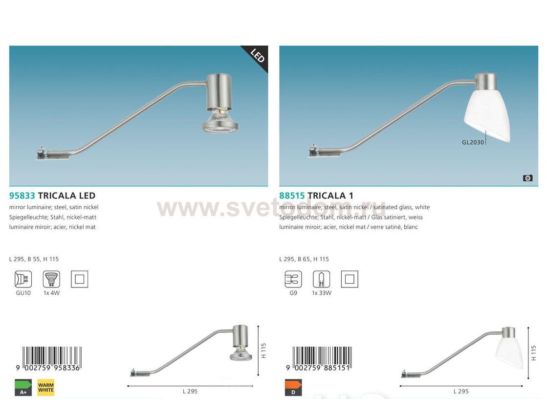 Cветодиод. подсветка для зеркал TRICALA LED, 1х4W(GU10), L295, H115, cталь, никель матовый применяется преимущественно в домашнем освещении с использованием стандартных выключателей и переключателей для сетей 220V.