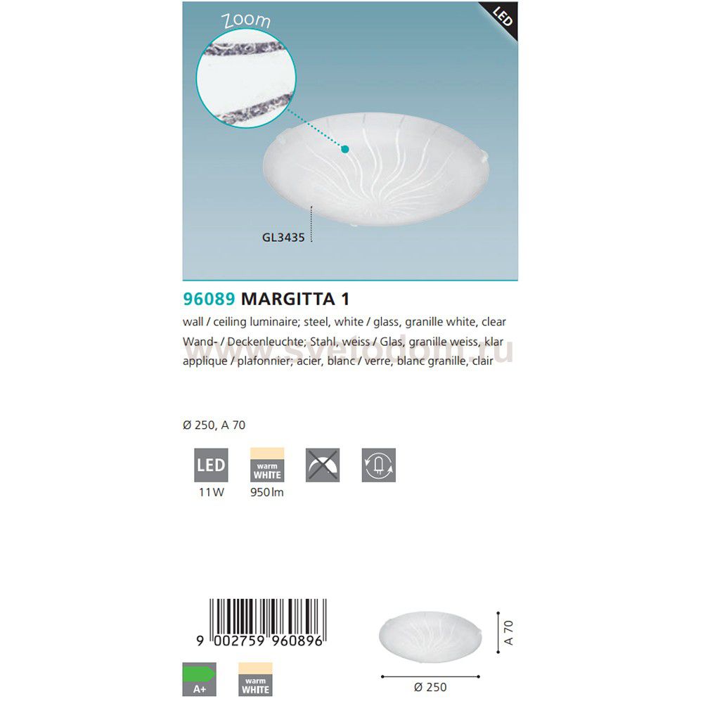 Светодиодный настенно-потолочный светильник MARGITTA 1, 11W(LED), ?245, сталь, белый/стекло, гранилли белый, прозрач. применяется преимущественно в домашнем освещении с использованием стандартных выключателей и переключателей для сетей 220V.