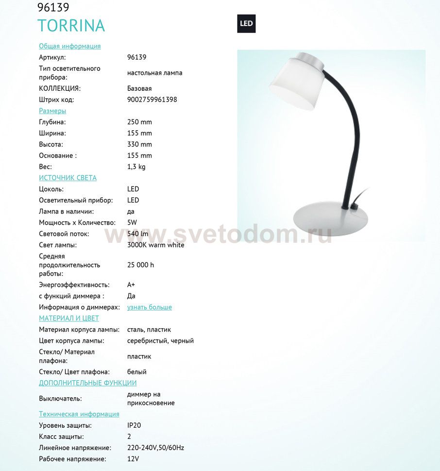 Светодиодный наст. лампа TORRINA с рег-кой и сенс. димм., 5W(LED), L250, H330, сталь, пластик, черн., серебр./пластик, бел. применяется преимущественно в домашнем освещении с использованием стандартных выключателей и переключателей для сетей 220V.
