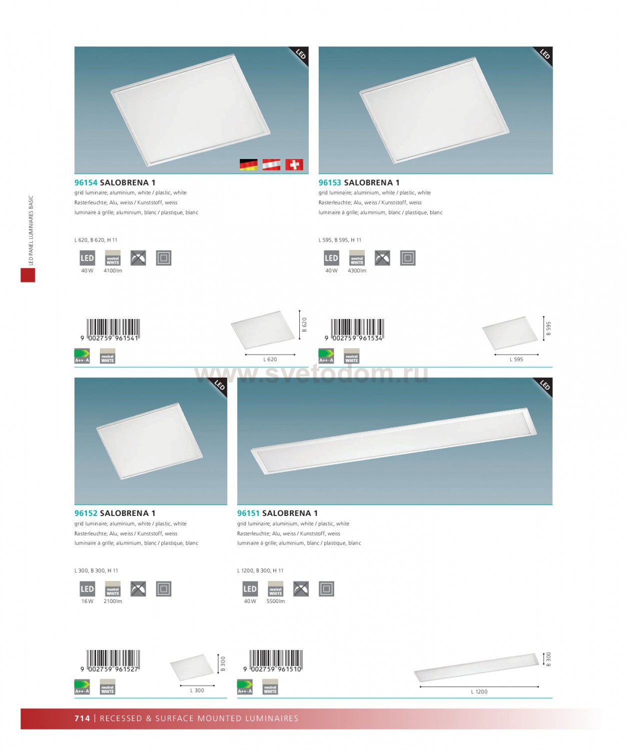 Светодиодный растровый светильник SALOBRENA 1, 40W(LED), 620х620, алюминий, белый/пластик, белый, нейтр. свет применяется преимущественно в домашнем освещении с использованием стандартных выключателей и переключателей для сетей 220V.