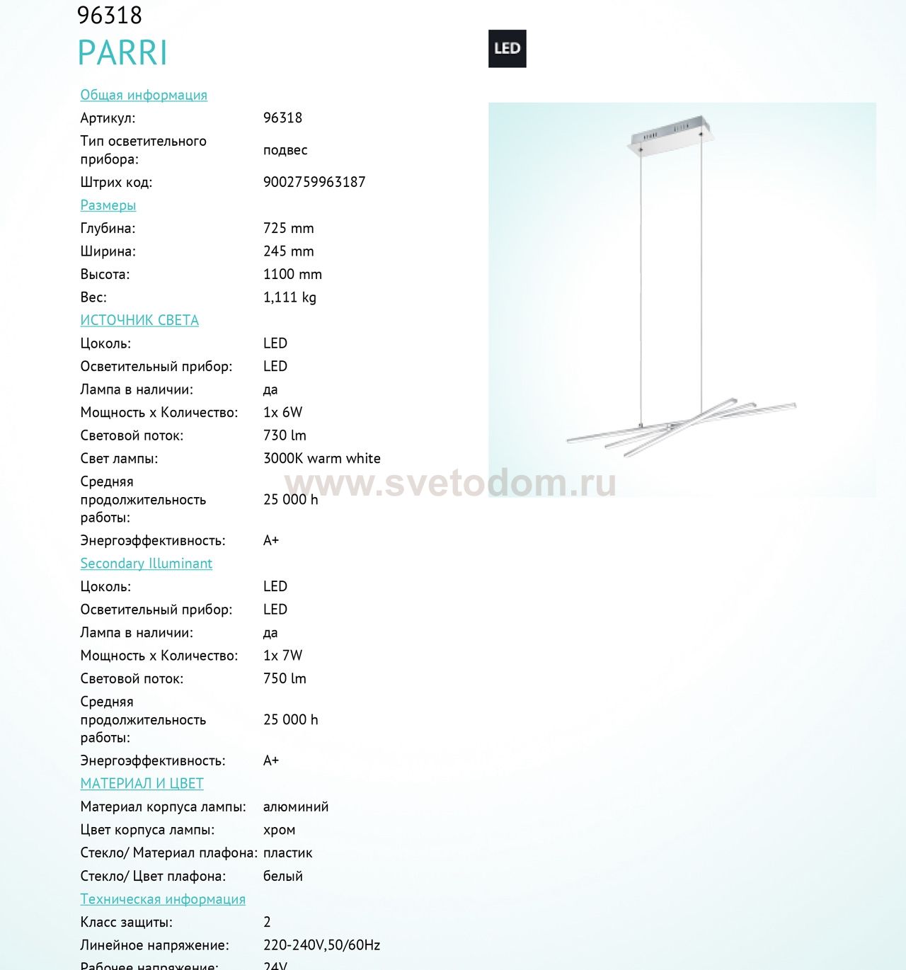Светодиодный подвесной светильник Eglo 96318 PARRI сделает Ваш интерьер современным, стильным и запоминающимся! Наиболее функционально и эстетически привлекательно модель будет смотреться в гостиной, зале, холле или другой комнате. А в комплекте с настенными бра и торшером из этой же коллекции, сделает интерьер по-дизайнерски профессиональным и законченным.