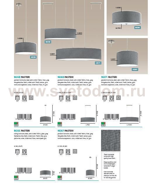 Подвесной светильник Eglo 96368 PASTERI отличается регулировкой по высоте и сделает Ваш интерьер современным, стильным и запоминающимся! Наиболее функционально и эстетически привлекательно модель будет смотреться в гостиной, зале, холле или другой комнате. А в комплекте с люстрой, бра или торшером из этой же коллекции сделает ремонт по-дизайнерски профессиональным и законченным.