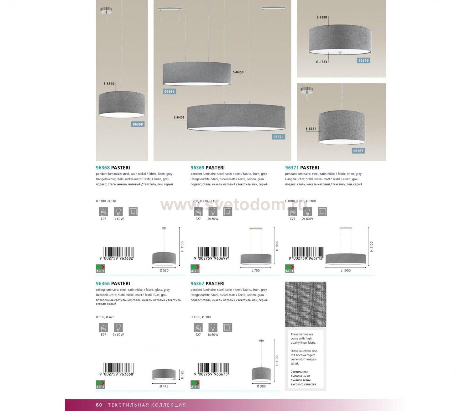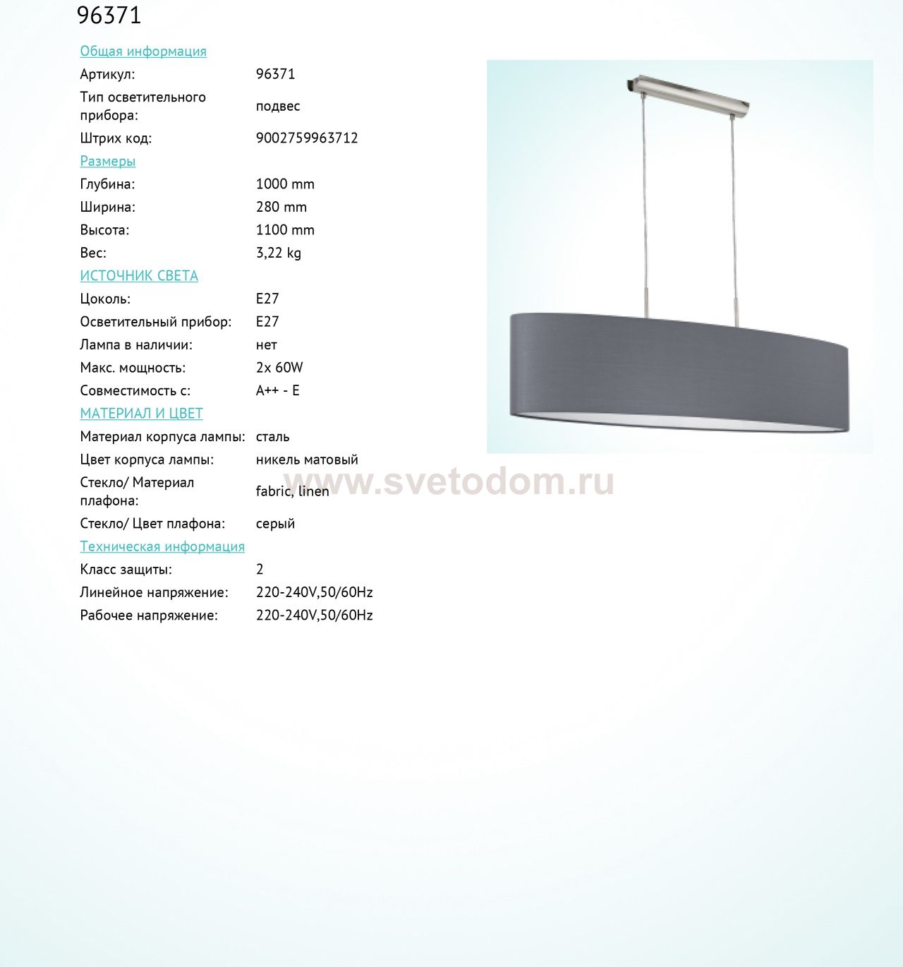 Подвесной светильник Eglo 96371 PASTERI сделает Ваш интерьер современным, стильным и запоминающимся! Наиболее функционально и эстетически привлекательно модель будет смотреться в гостиной, зале, холле или другой комнате. А в комплекте с настенными бра и торшером из этой же коллекции, сделает интерьер по-дизайнерски профессиональным и законченным.