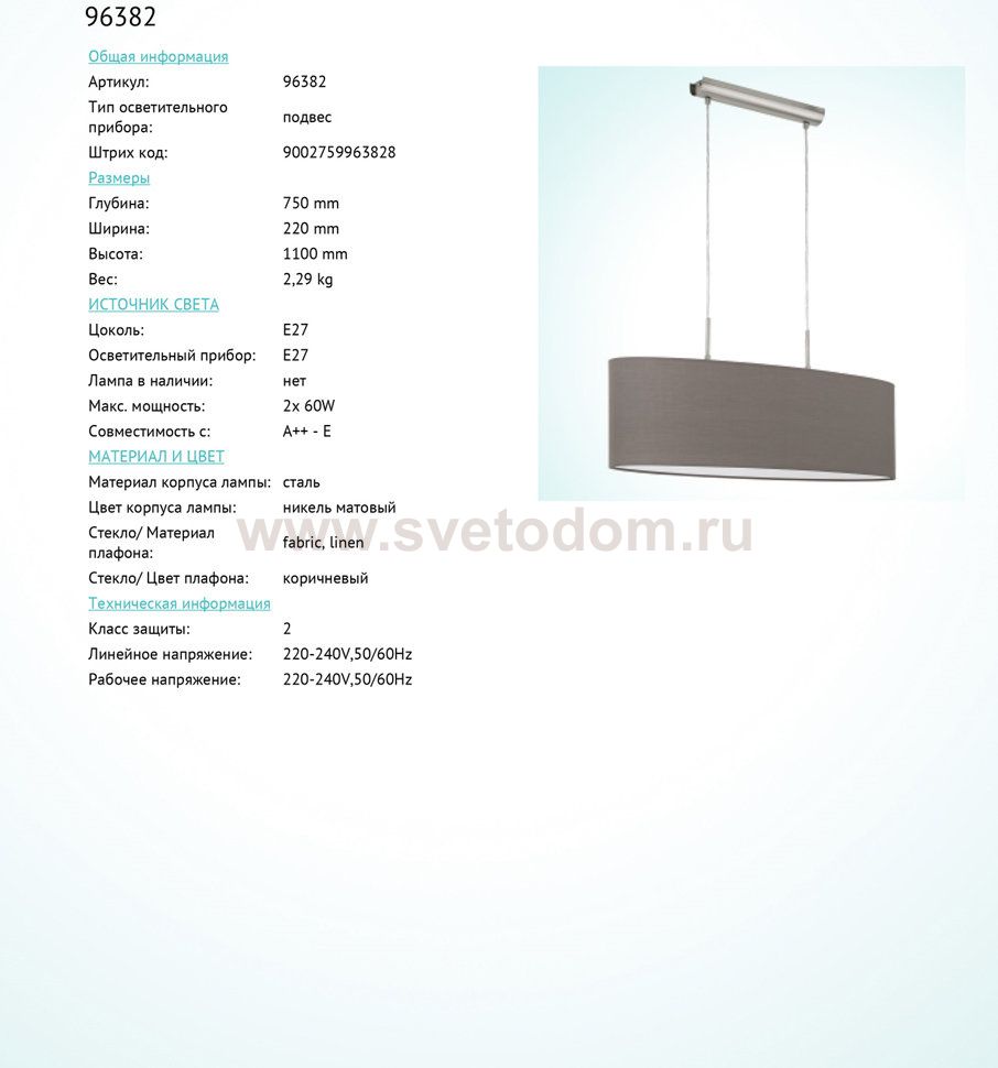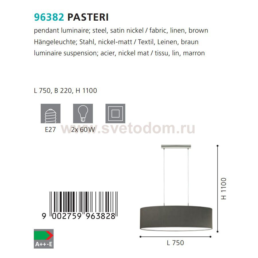 Подвесной светильник Eglo 96382 PASTERI отличается регулировкой по высоте и сделает Ваш интерьер современным, стильным и запоминающимся! Наиболее функционально и эстетически привлекательно модель будет смотреться в гостиной, зале, холле или другой комнате. А в комплекте с люстрой, бра или торшером из этой же коллекции сделает ремонт по-дизайнерски профессиональным и законченным.