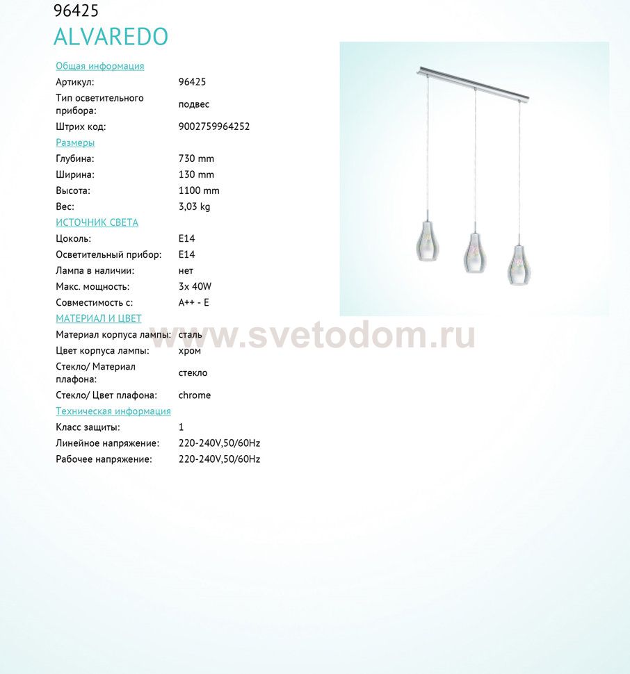 Подвесной светильник Eglo 96425 ALVAREDO отличается регулировкой по высоте и сделает Ваш интерьер современным, стильным и запоминающимся! Наиболее функционально и эстетически привлекательно модель будет смотреться в гостиной, зале, холле или другой комнате. А в комплекте с люстрой, бра или торшером из этой же коллекции сделает ремонт по-дизайнерски профессиональным и законченным.