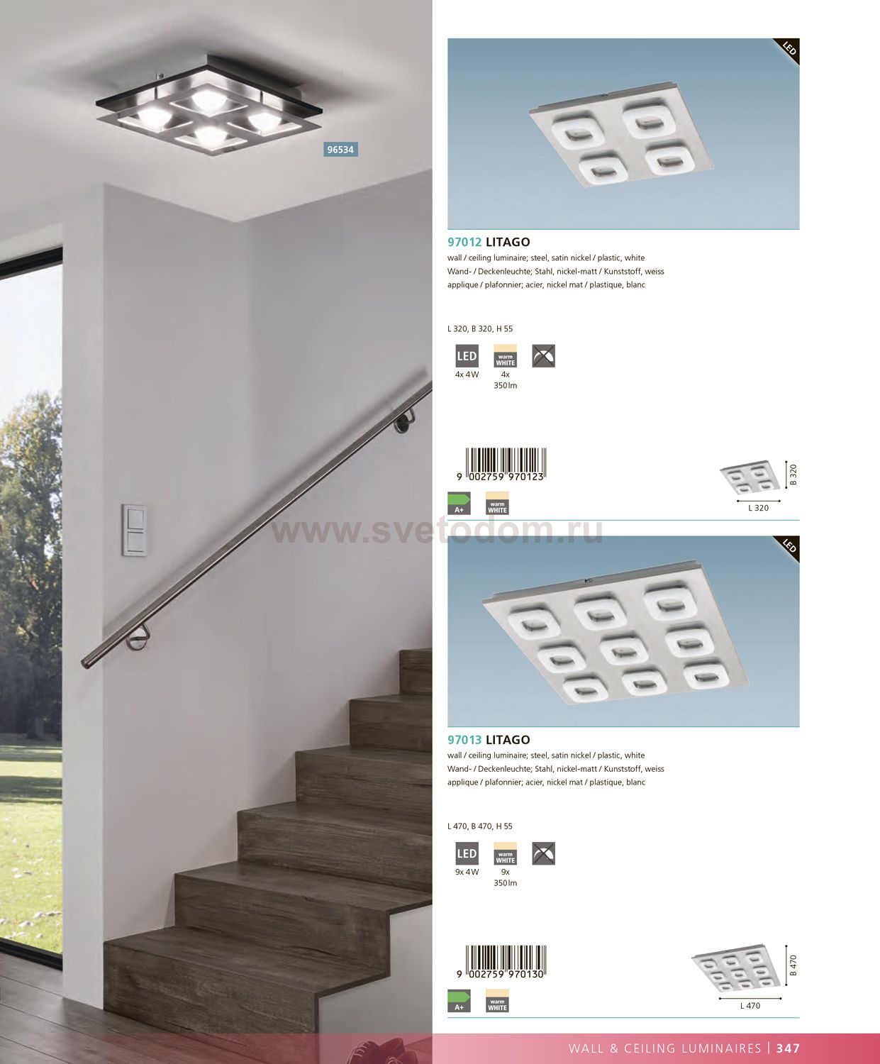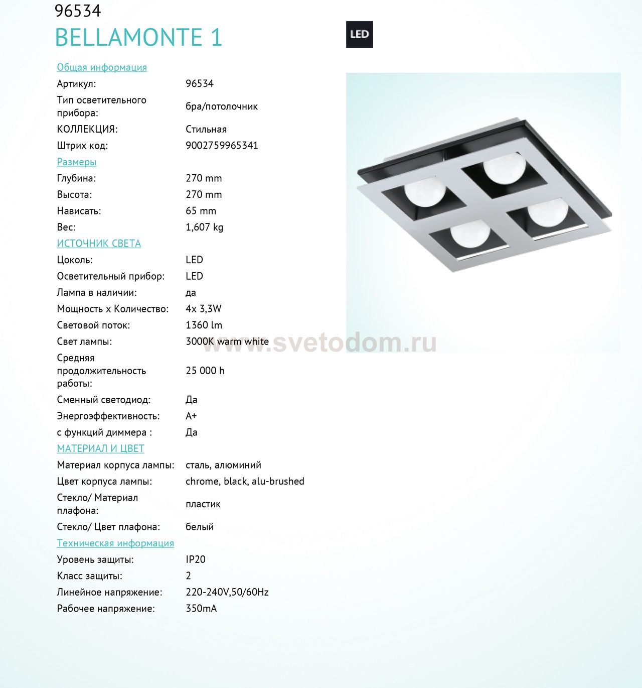 Светильник настенно-потолочный Eglo 96534 BELLAMONTE 1 сделает Ваш интерьер современным, стильным и запоминающимся! Наиболее функционально и эстетически привлекательно модель будет смотреться в гостиной, зале, холле или другой комнате. А в комплекте с люстрой и торшером из этой же коллекции, сделает помещение по-дизайнерски профессиональным и законченным.