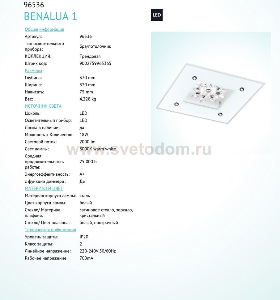 Светодиодный светильник настенно-потолочный Eglo 96536 BENALUA 1 сделает Ваш интерьер современным, стильным и запоминающимся! Наиболее функционально и эстетически привлекательно модель будет смотреться в гостиной, зале, холле или другой комнате. А в комплекте с люстрой и торшером из этой же коллекции, сделает помещение по-дизайнерски профессиональным и законченным.