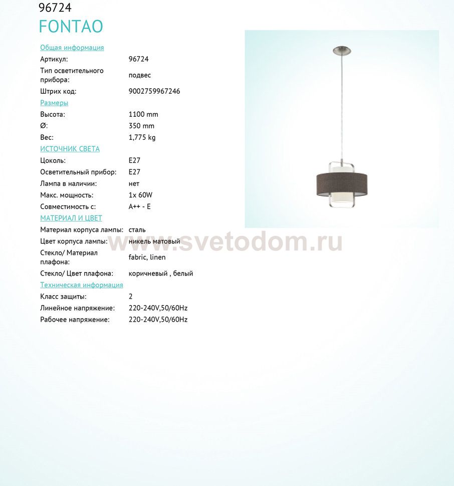 Подвесной светильник Eglo 96724 FONTAO отличается регулировкой по высоте и сделает Ваш интерьер современным, стильным и запоминающимся! Наиболее функционально и эстетически привлекательно модель будет смотреться в гостиной, зале, холле или другой комнате. А в комплекте с люстрой, бра или торшером из этой же коллекции сделает ремонт по-дизайнерски профессиональным и законченным.