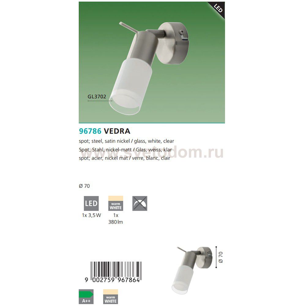 Светильник спот Eglo 96786 VEDRA отличается поворотной способностью регулировки светового потока и сделает Ваше помещение современным, стильным и запоминающимся! Наиболее функционально и эстетически привлекательно модель будет смотреться в гостиной, зале, холле или другой комнате. А в комплекте с люстрой, бра или торшером из этой же коллекции сделает интерьер по-дизайнерски профессиональным и законченным.