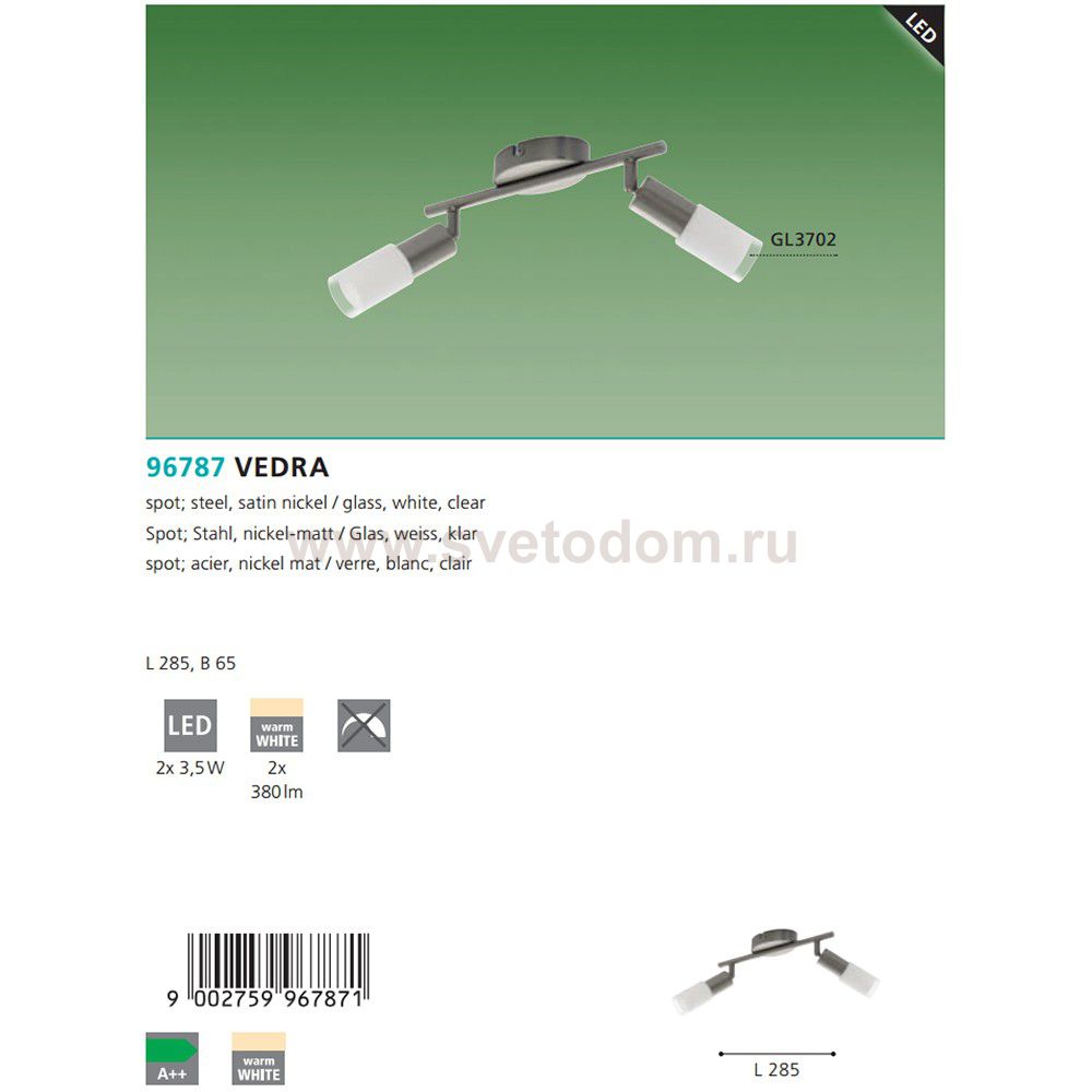 Светильник спот Eglo 96787 VEDRA отличается поворотной способностью регулировки светового потока и сделает Ваше помещение современным, стильным и запоминающимся! Наиболее функционально и эстетически привлекательно модель будет смотреться в гостиной, зале, холле или другой комнате. А в комплекте с люстрой, бра или торшером из этой же коллекции сделает интерьер по-дизайнерски профессиональным и законченным.