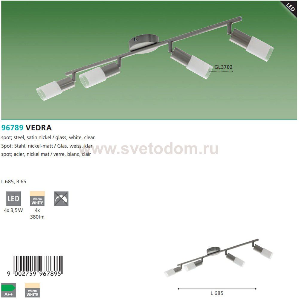 Светильник спот Eglo 96789 VEDRA отличается поворотной способностью регулировки светового потока и сделает Ваше помещение современным, стильным и запоминающимся! Наиболее функционально и эстетически привлекательно модель будет смотреться в гостиной, зале, холле или другой комнате. А в комплекте с люстрой, бра или торшером из этой же коллекции сделает интерьер по-дизайнерски профессиональным и законченным.