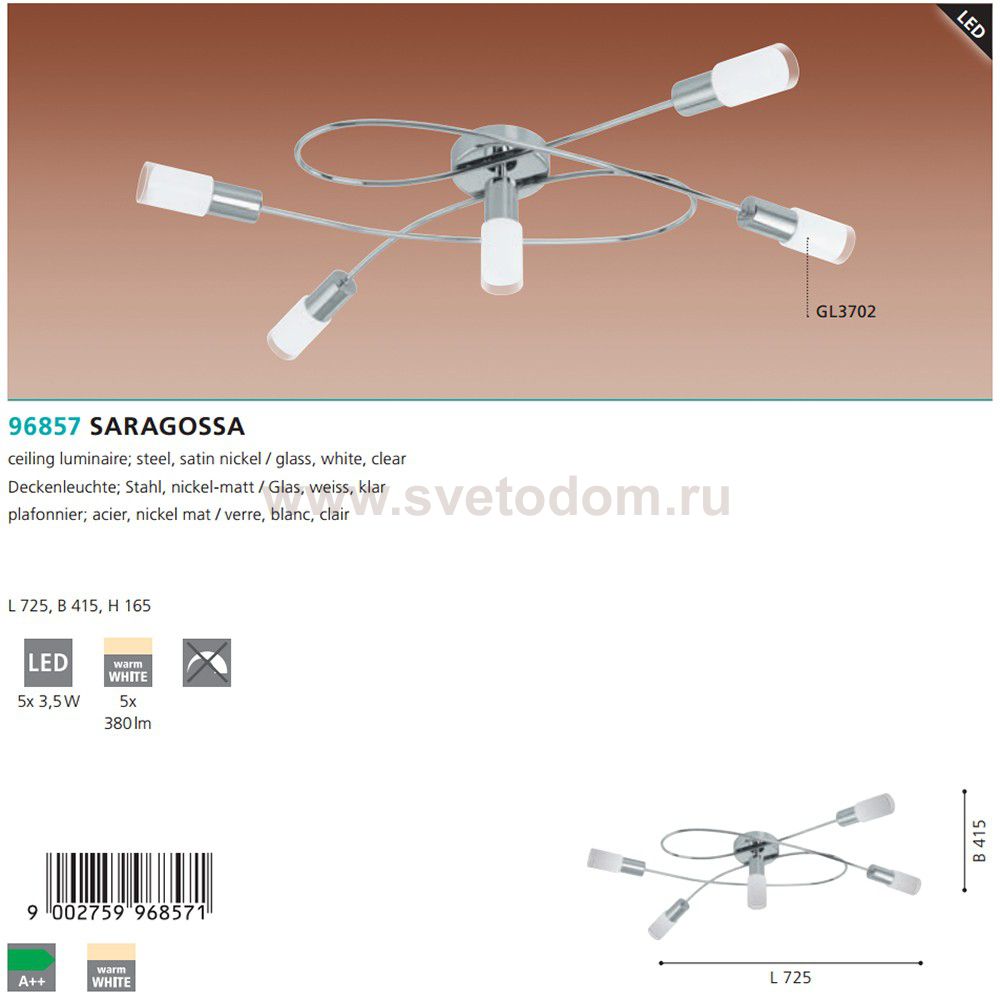 Cветодиодиодный потолочный cветильник Eglo 96857 SARAGOSSA сделает Ваш интерьер современным, стильным и запоминающимся! Наиболее функционально и эстетически привлекательно модель будет смотреться в гостиной, зале, холле или другой комнате. А в комплекте с люстрой и торшером из этой же коллекции, сделает помещение по-дизайнерски профессиональным и законченным.
