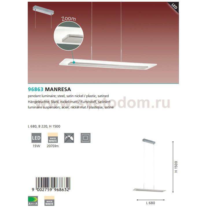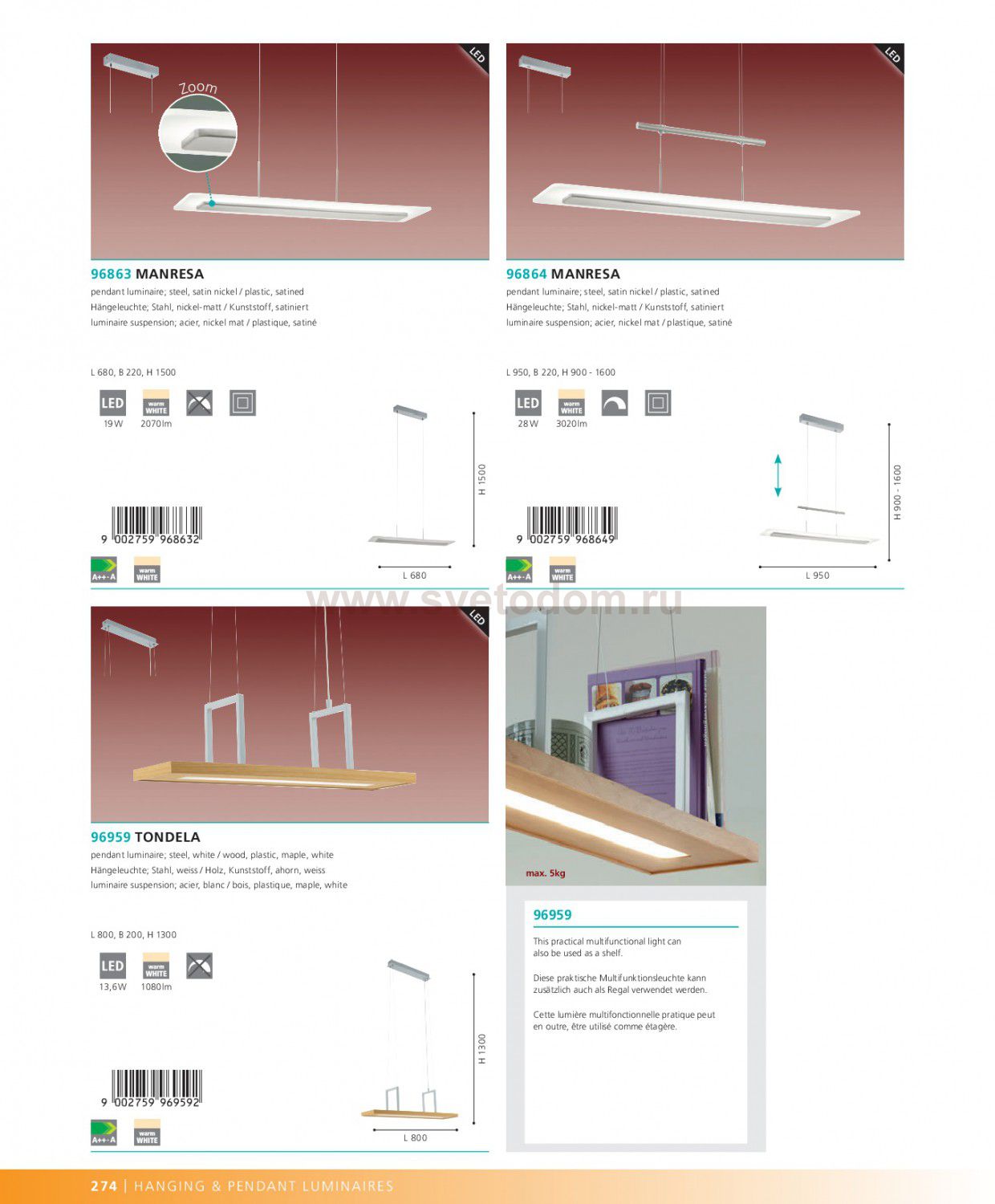Светодиодный подвесной светильник Eglo 96863 MANRESA отличается регулировкой по высоте и сделает Ваш интерьер современным, стильным и запоминающимся! Наиболее функционально и эстетически привлекательно модель будет смотреться в гостиной, зале, холле или другой комнате. А в комплекте с люстрой, бра или торшером из этой же коллекции сделает ремонт по-дизайнерски профессиональным и законченным.
