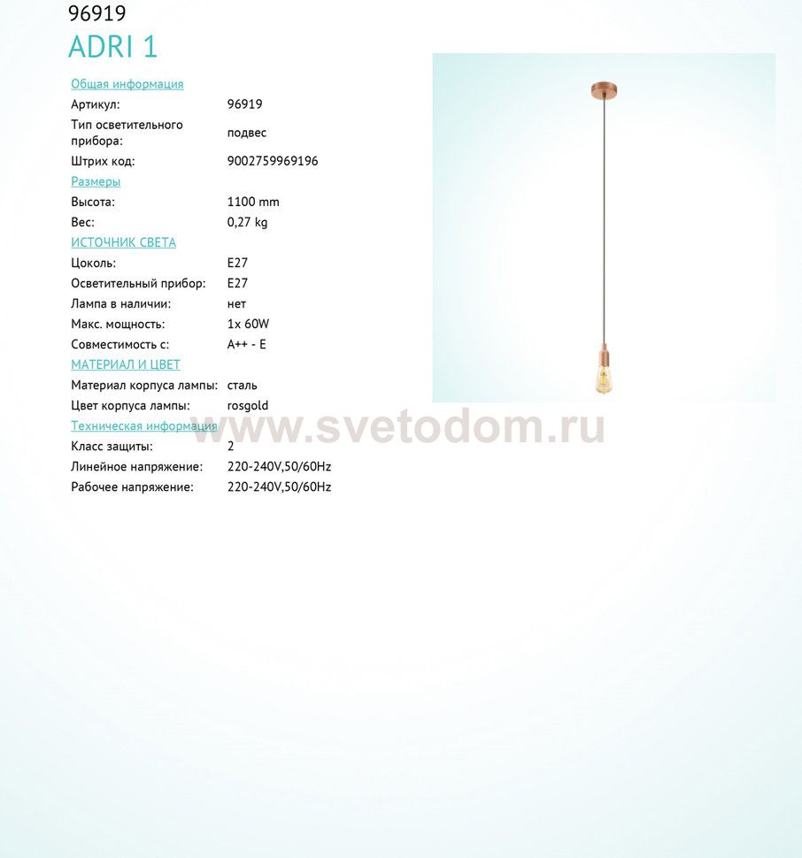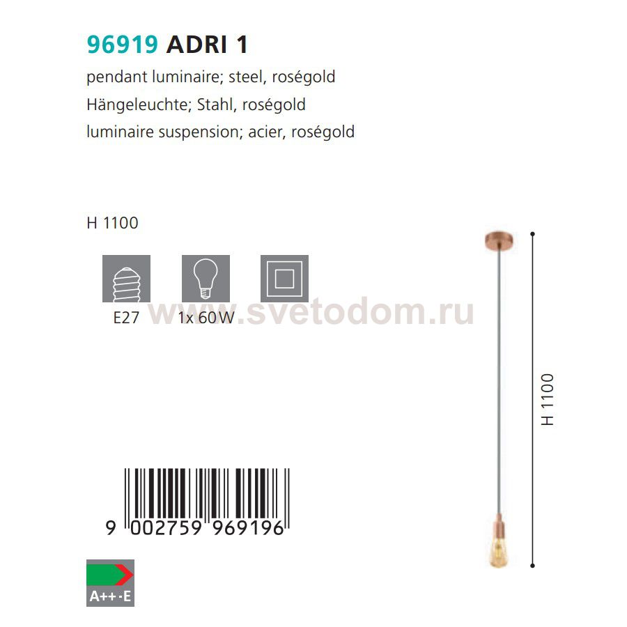 Подвесной светильник Eglo 96919 ADRI 1 отличается регулировкой по высоте и сделает Ваш интерьер современным, стильным и запоминающимся! Наиболее функционально и эстетически привлекательно модель будет смотреться в гостиной, зале, холле или другой комнате. А в комплекте с люстрой, бра или торшером из этой же коллекции сделает ремонт по-дизайнерски профессиональным и законченным.