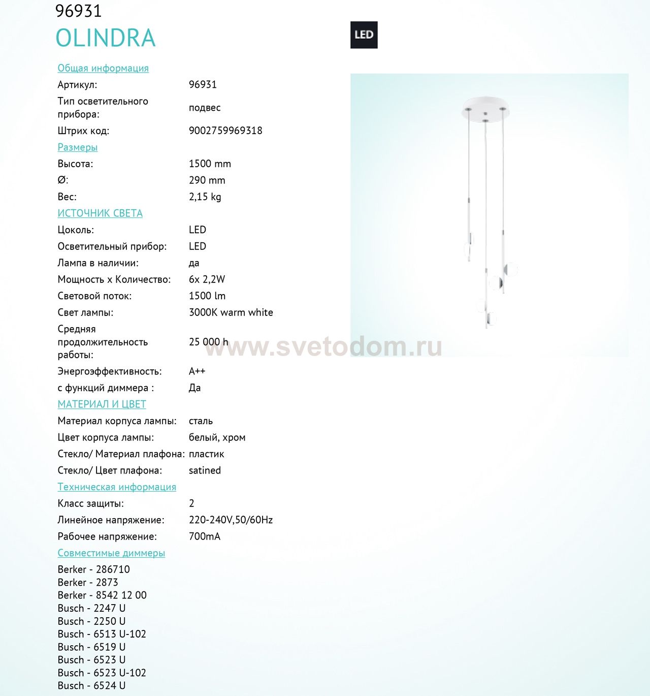 Подвесной потолочный светильник (люстра) OLINDRA светодиодный диммируемый Комментарий