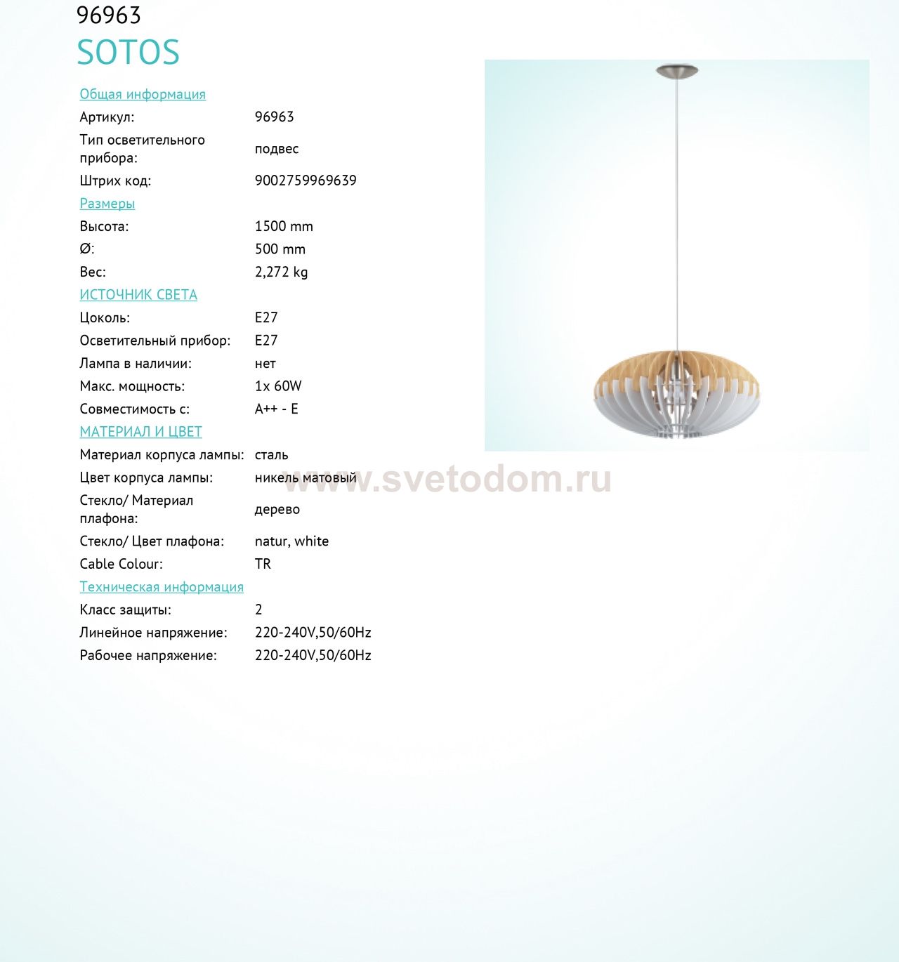Подвесной светильник Eglo 96963 SOTOS отличается регулировкой по высоте и сделает Ваш интерьер современным, стильным и запоминающимся! Наиболее функционально и эстетически привлекательно модель будет смотреться в гостиной, зале, холле или другой комнате. А в комплекте с люстрой, бра или торшером из этой же коллекции сделает ремонт по-дизайнерски профессиональным и законченным.