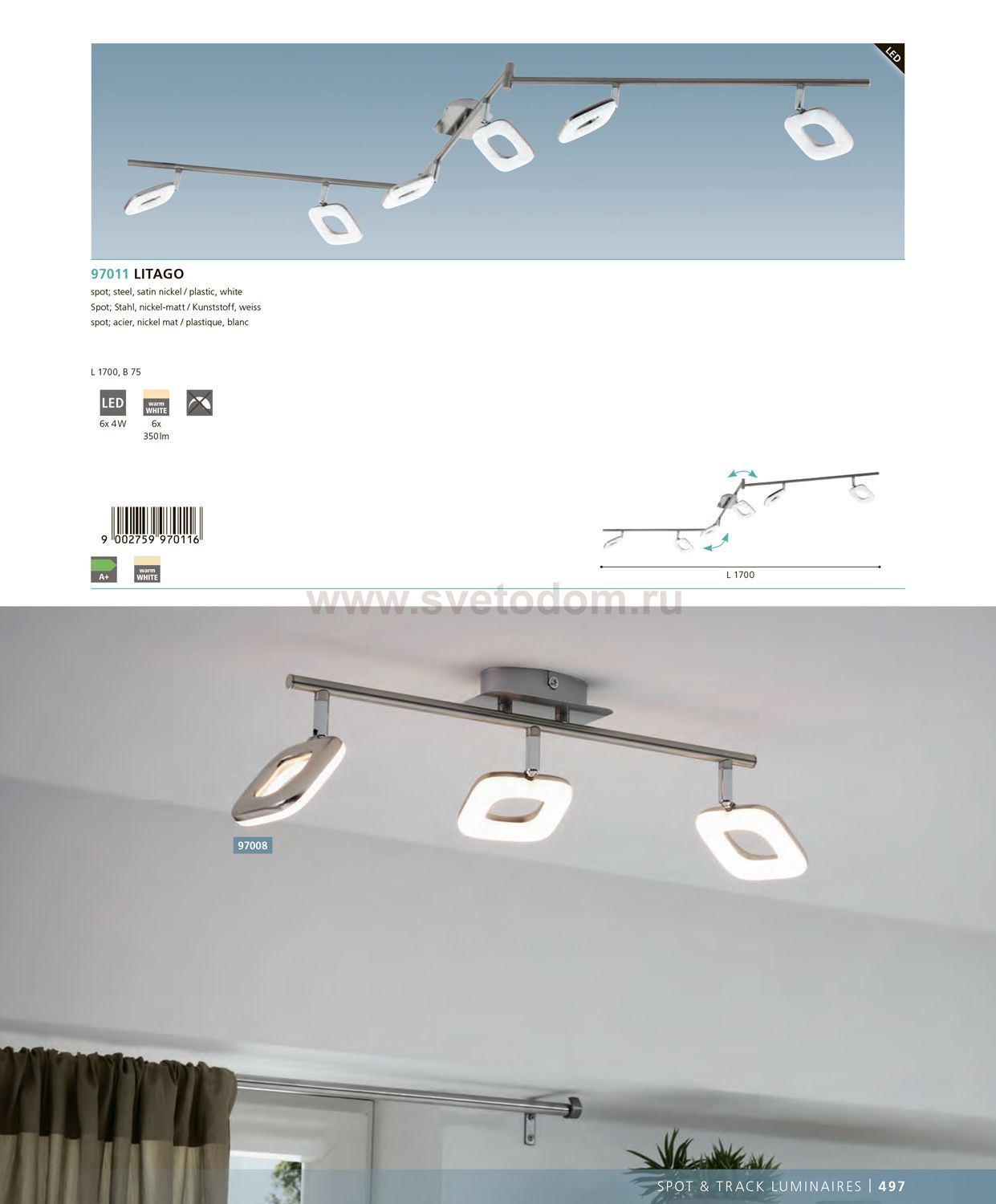 Светильник спот Eglo 97008 LITAGO отличается поворотной способностью регулировки светового потока и сделает Ваше помещение современным, стильным и запоминающимся! Наиболее функционально и эстетически привлекательно модель будет смотреться в гостиной, зале, холле или другой комнате. А в комплекте с люстрой, бра или торшером из этой же коллекции сделает интерьер по-дизайнерски профессиональным и законченным.