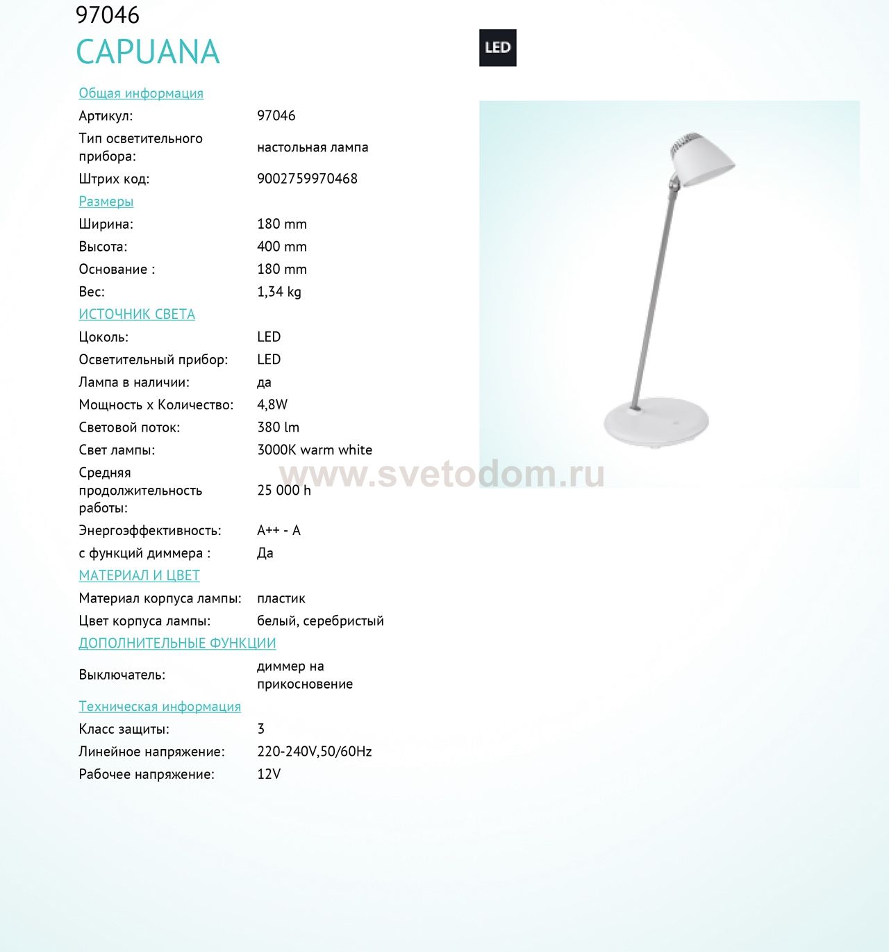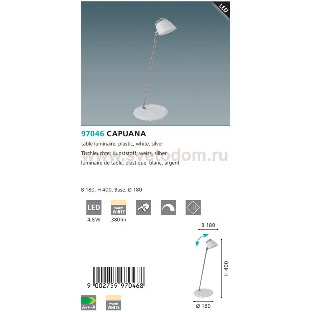 Настольная лампа Eglo 97046 CAPUANA обеспечит равномерное распределение света на столе. При выборе обратите внимание на характеристики, позволяющие приобрести наиболее подходящую модель люстры или торшера из аналогичной коллекции и в той же цветовой гамме, что сделает помещение по-дизайнерски профессиональным и законченным.