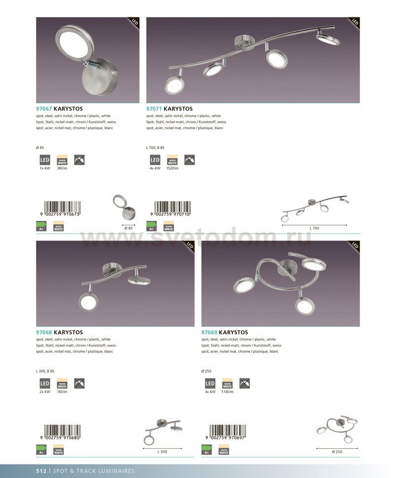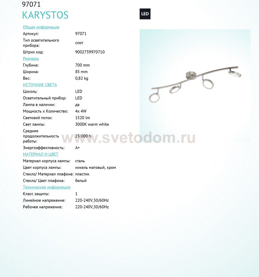 Светильник спот Eglo 97071 KARYSTOS отличается поворотной способностью регулировки светового потока и сделает Ваше помещение современным, стильным и запоминающимся! Наиболее функционально и эстетически привлекательно модель будет смотреться в гостиной, зале, холле или другой комнате. А в комплекте с люстрой, бра или торшером из этой же коллекции сделает интерьер по-дизайнерски профессиональным и законченным.