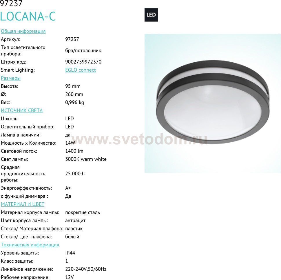 Уличный светодный светильник наcтенно-потолочный Eglo 97237 LOCANA-C не просто обеспечит качественное наружное освещение, но и станет украшением Вашего загородного участка. Модель выполнена из современных материалов и имеет влагозащитный корпус, благодаря которому ей не страшны осадки.