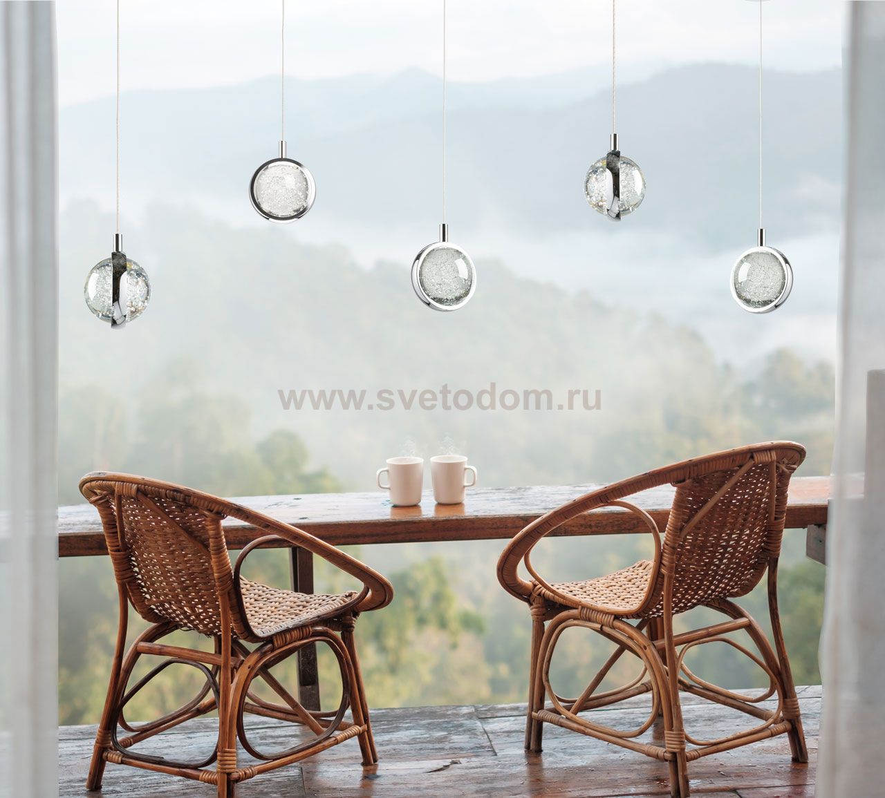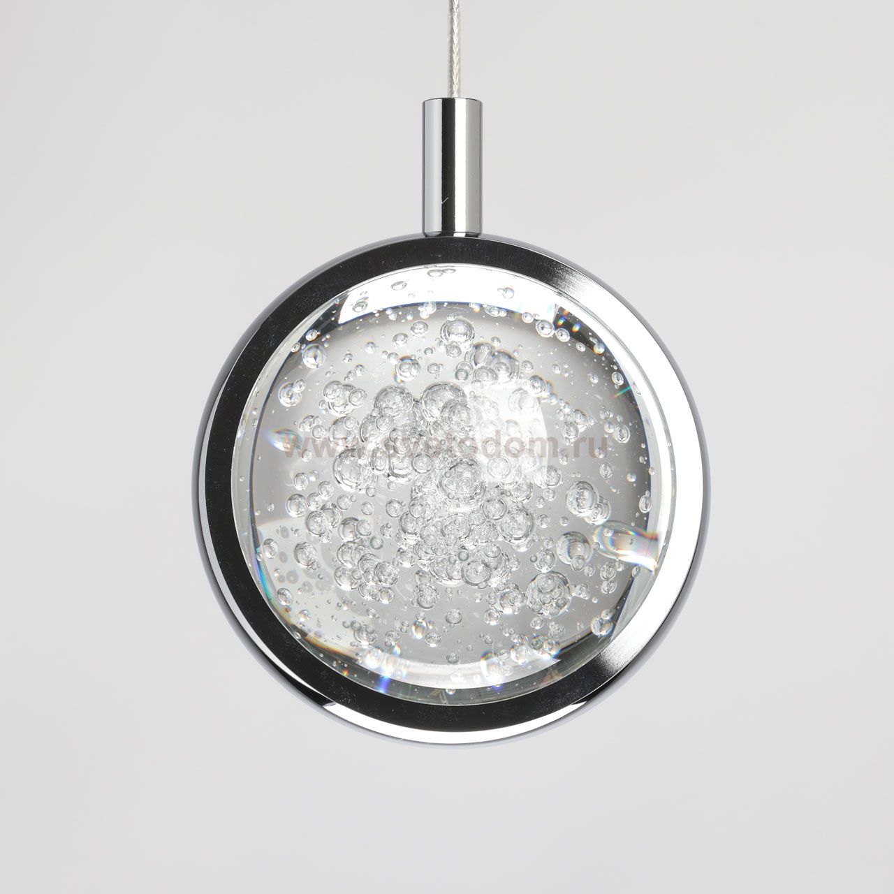 Основание светильника выполнено из сплава алюминия с цинком, обработано по технологии брашинга и гальванизировано в цвет хрома. Светодиодный источник света закрыт сферой из стекла с включениями пузырьков. Комментарий