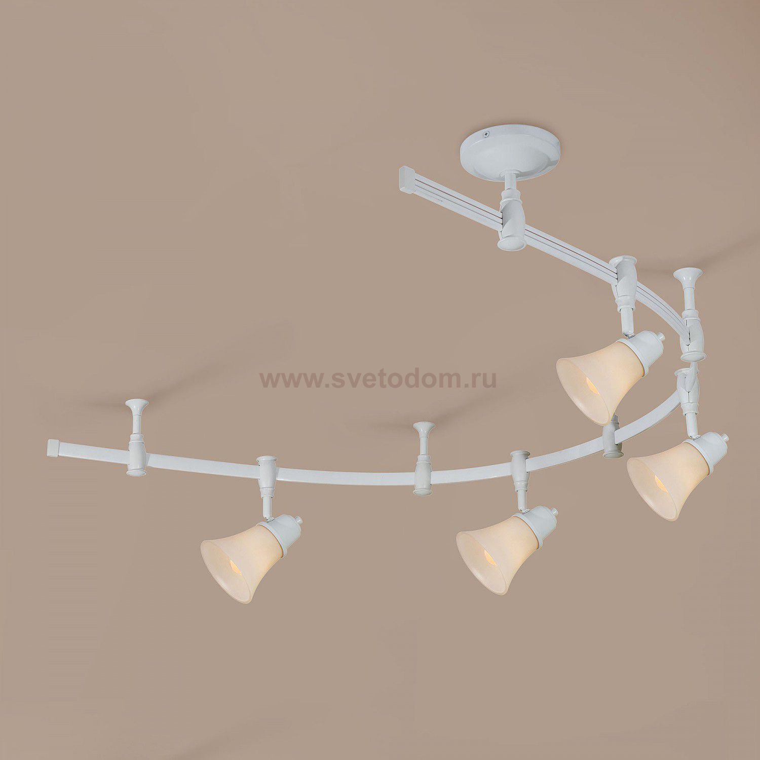 Трековая система 220V на гибкой шине длиной 200см, в комплекте 4 стойки крепления шины и 4 головки, размер головки 12см, лампы Е14 или R50, Белое стекло и современный дизайн Комментарий