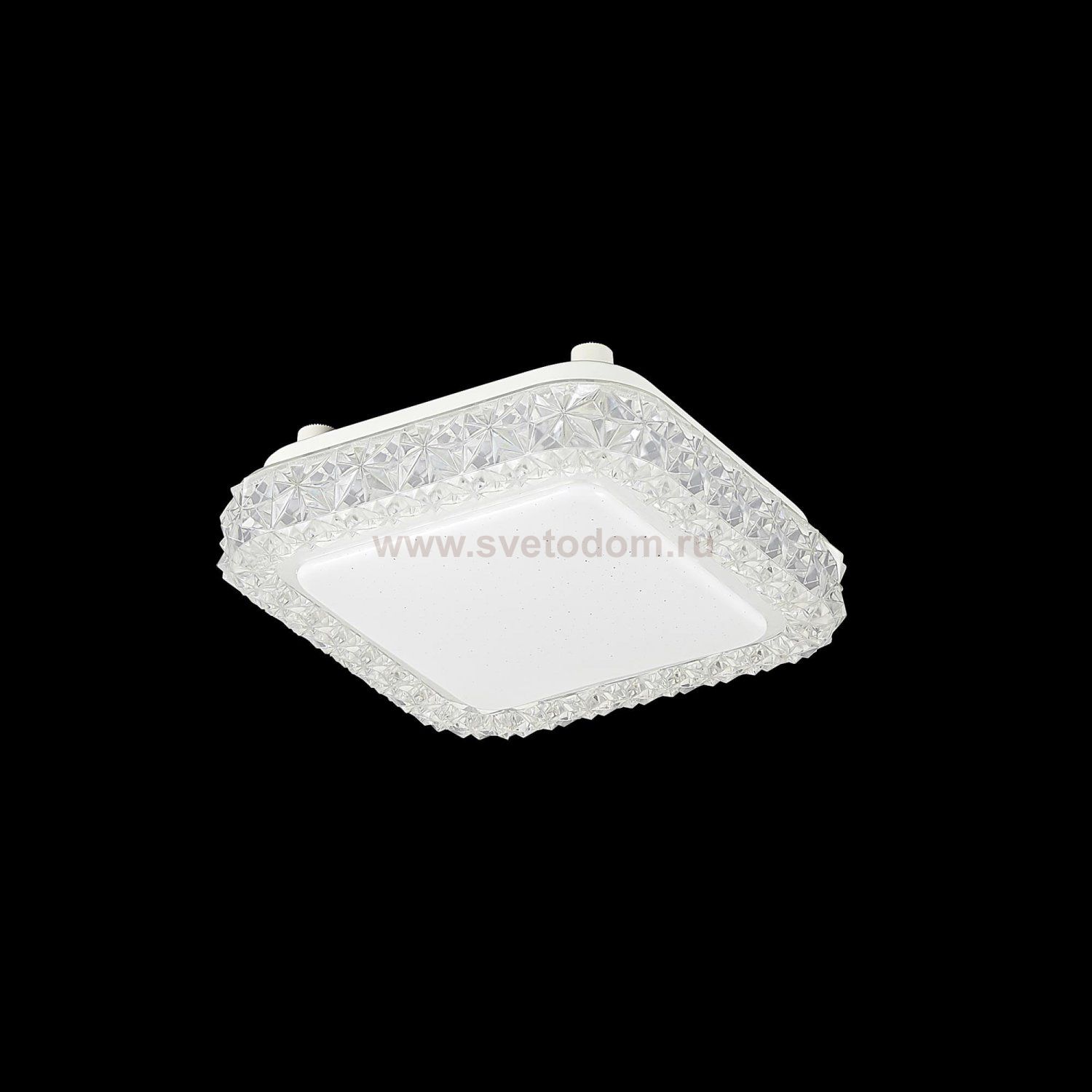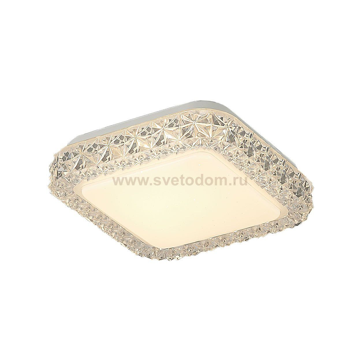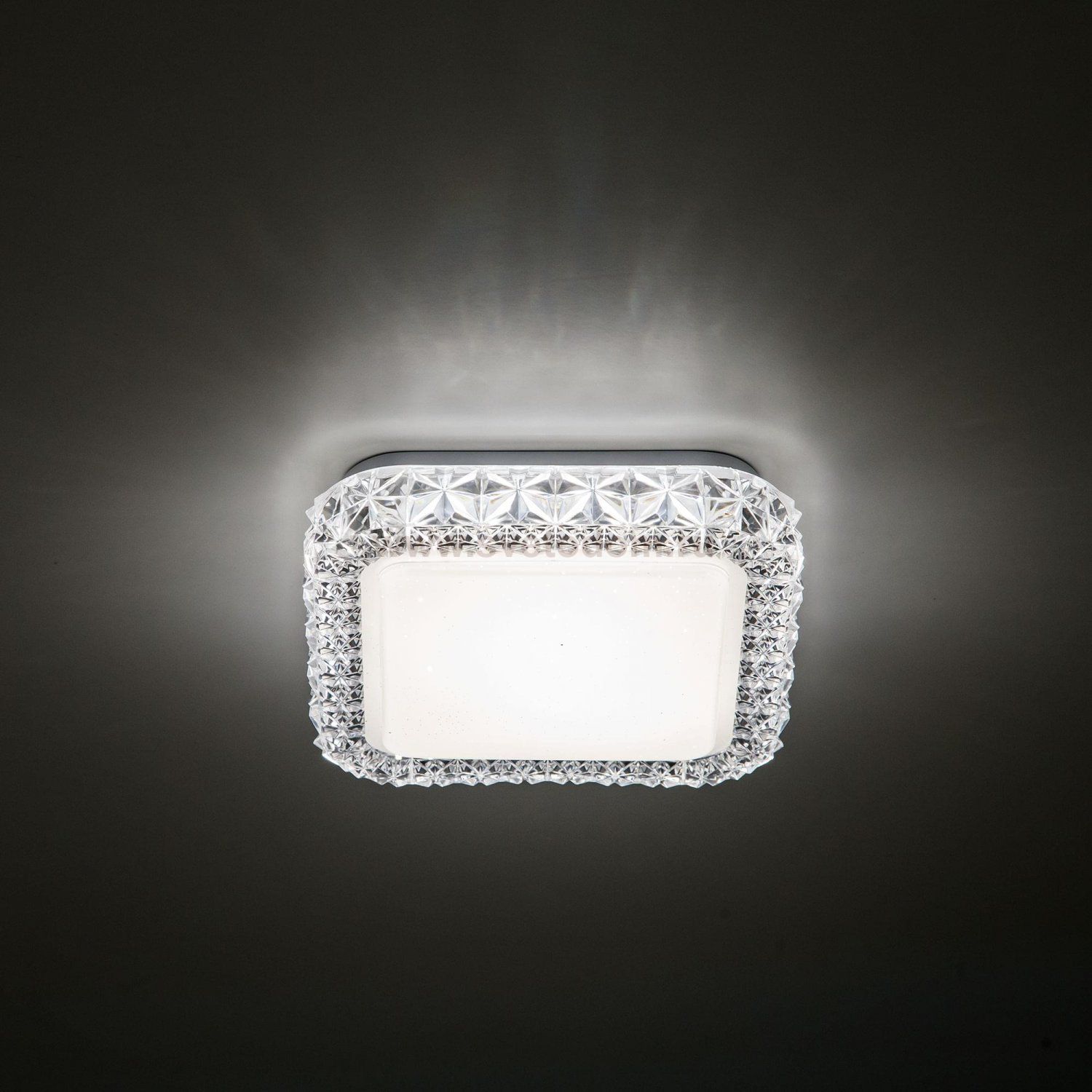 Габариты 18*18см, Высота 6,5см, Светодиодный светильник мощностью 12Вт с хрустальным эффектом на ободе и эффектом "старлайт" на матовом рассеивателе, Уровни мощности 100-50-5% управляются обычным выключателем Комментарий