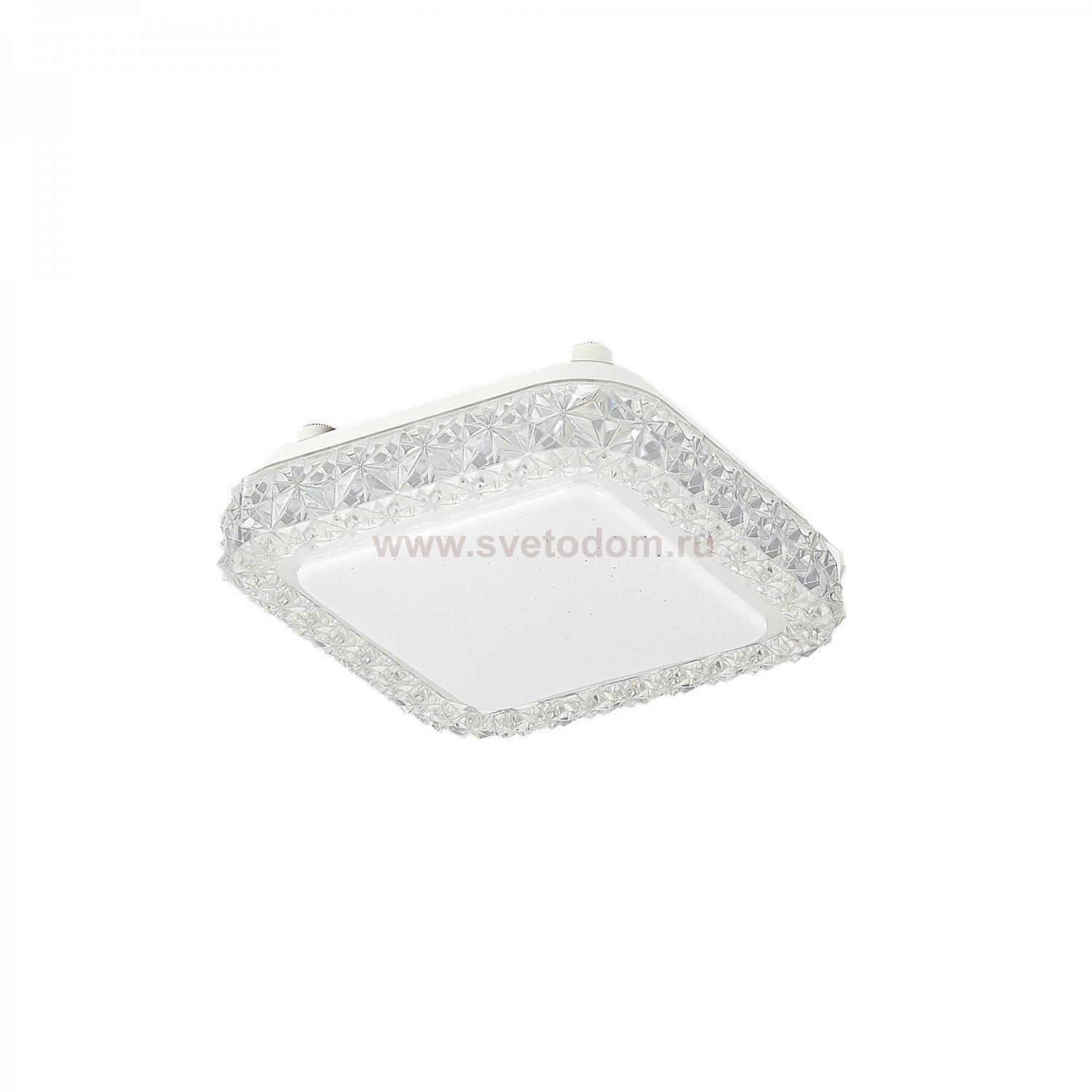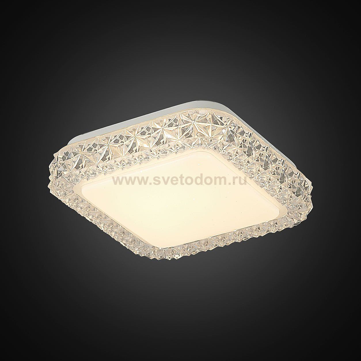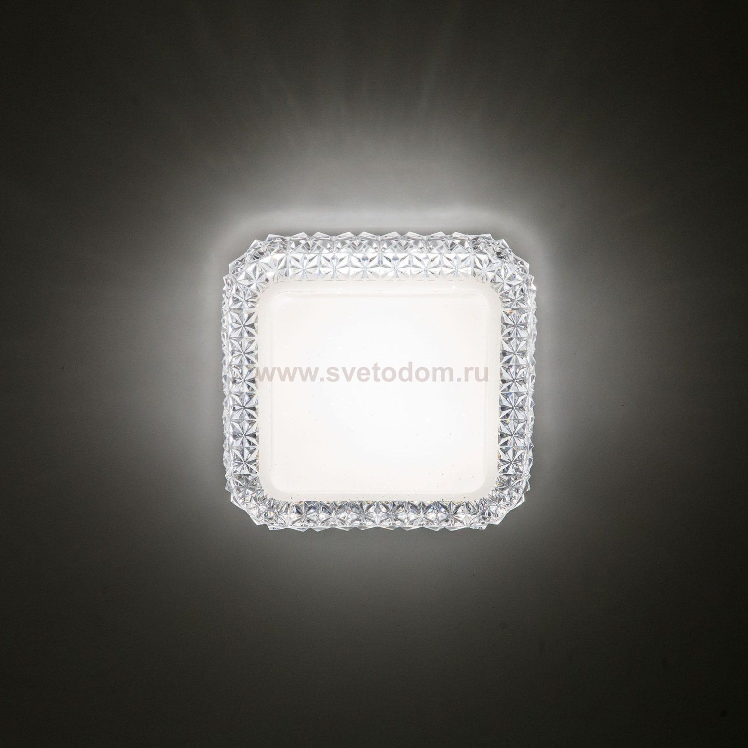 Габариты 18*18см, Высота 6,5см, Светодиодный светильник мощностью 12Вт с хрустальным эффектом на ободе и эффектом "старлайт" на матовом рассеивателе, Уровни мощности 100-50-5% управляются обычным выключателем Комментарий
