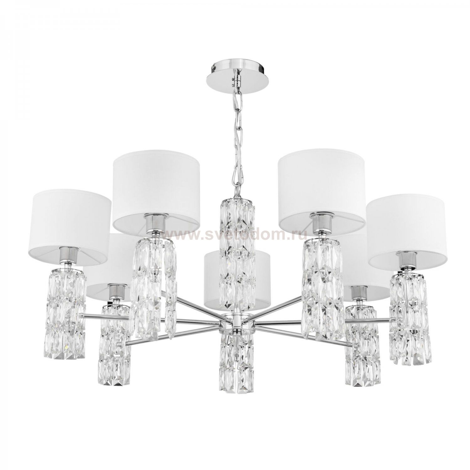 Арматура из металла, цвет – хром. Абажуры из текстиля, нанесенного на ПВХ. Цвет – белый. Декор – массивные кристаллы сложной огранки. Высота подвесных моделей регулируется.