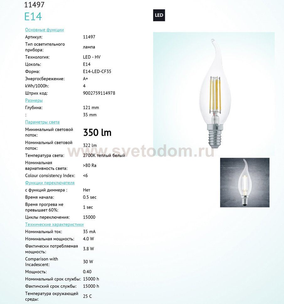 В интернет-магазине «Светодом» можно купить не только люстры и светильники, но и лампочки. В нашем каталоге представлены светодиодные, галогенные, энергосберегающие модели и лампы накаливания. В ассортименте имеются изделия разной мощности, поэтому у нас Вы сможете приобрести все необходимое для освещения. Лампа Eglo 11497 филаментная "Свеча на ветру" обеспечит отличное качество освещения. При покупке ознакомьтесь с параметрами в разделе «Характеристики», чтобы не ошибиться в выборе. Там же указано, для каких осветительных приборов Вы можете использовать лампу Eglo 11497 филаментная "Свеча на ветру"Eglo 11497 филаментная "Свеча на ветру". Для оформления покупки воспользуйтесь «Корзиной». При наличии вопросов Вы можете позвонить нашим менеджерам по одному из контактных номеров. Мы доставляем заказы в Москву, Екатеринбург и другие города России.