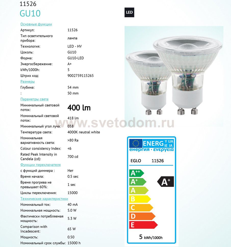 В интернет-магазине «Светодом» можно купить не только люстры и светильники, но и лампочки. В нашем каталоге представлены светодиодные, галогенные, энергосберегающие модели и лампы накаливания. В ассортименте имеются изделия разной мощности, поэтому у нас Вы сможете приобрести все необходимое для освещения. Лампа Eglo 11526 СOB, 2х5W (GU10), 4000K, 400lm, 2 шт. в комплекте обеспечит отличное качество освещения. При покупке ознакомьтесь с параметрами в разделе «Характеристики», чтобы не ошибиться в выборе. Там же указано, для каких осветительных приборов Вы можете использовать лампу Eglo 11526 СOB, 2х5W (GU10), 4000K, 400lm, 2 шт. в комплектеEglo 11526 СOB, 2х5W (GU10), 4000K, 400lm, 2 шт. в комплекте. Для оформления покупки воспользуйтесь «Корзиной». При наличии вопросов Вы можете позвонить нашим менеджерам по одному из контактных номеров. Мы доставляем заказы в Москву, Екатеринбург и другие города России.