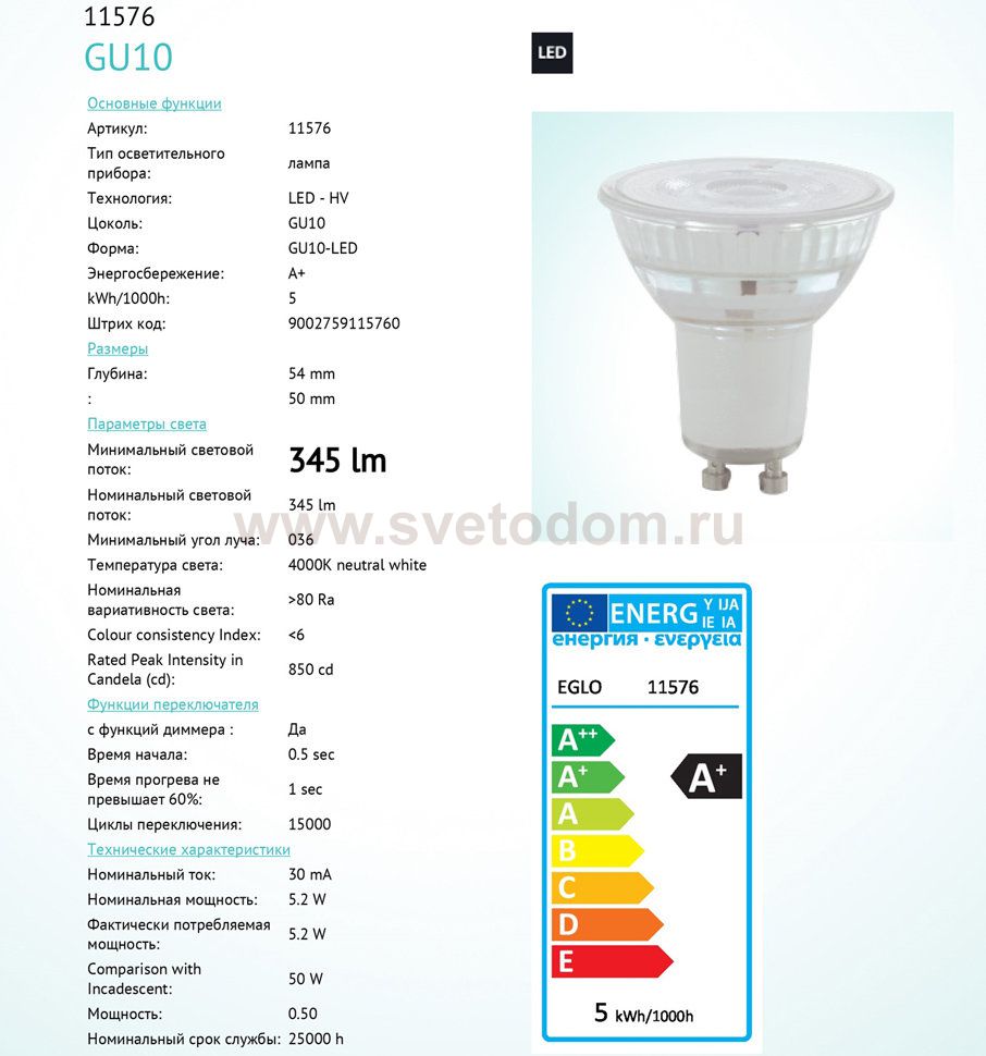 Лампа светодиодная Eglo 11576 является неотъемлемой частью освещения в доме или любом другом помещении, ведь благодаря этой модели мы сможем в полном объеме использовать соответствующий данному цоколю светильник.