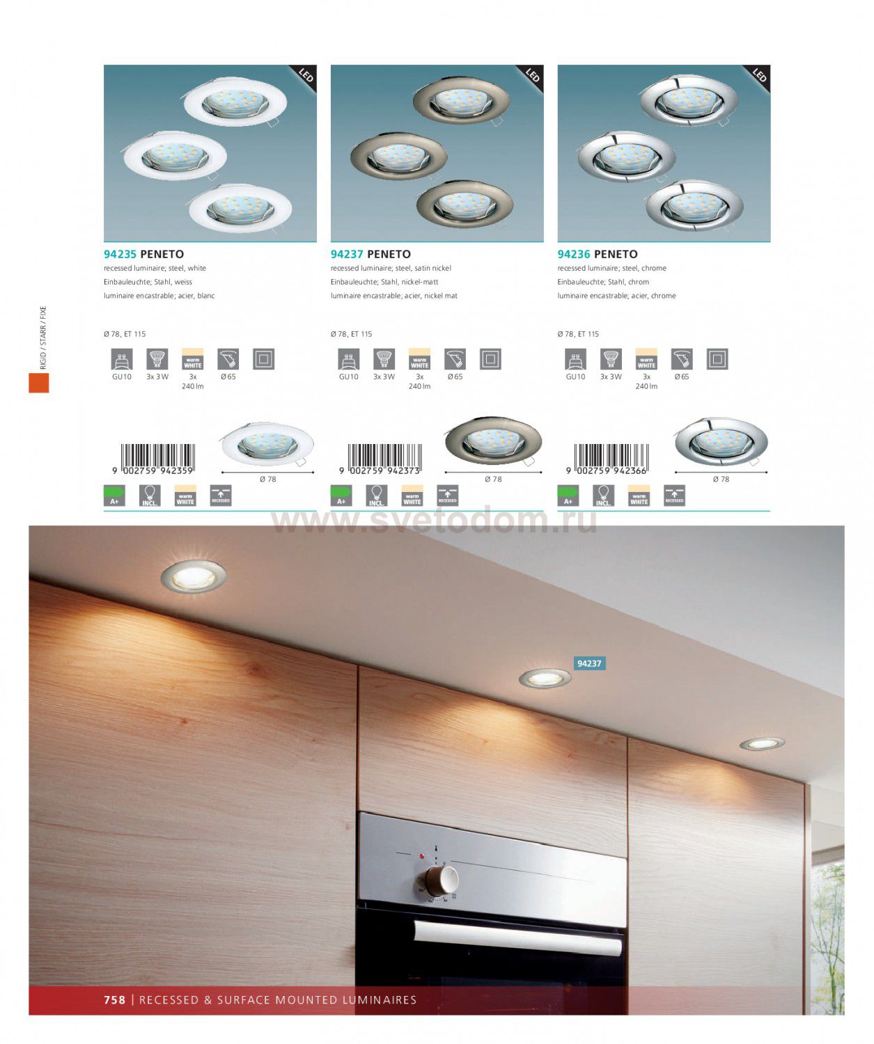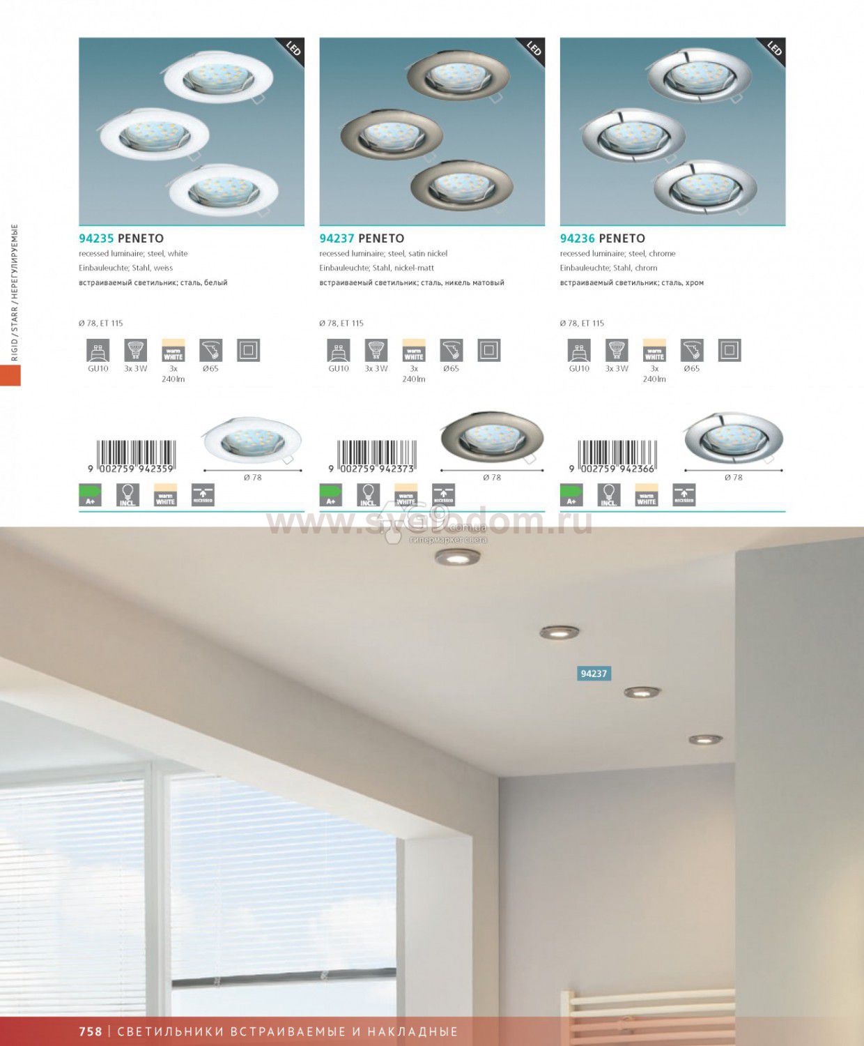Встраиваемый и накладный светильник Eglo 94237 PENETO является тенденцией современного функционального врезного потолочного освещения для гостиной, зала, спальни или другого помещения. При выборе обратите внимание на цветовую гамму модели и подберите подходящие люстры, бра или торшеры из аналогичной коллекции, что сделает помещение по-дизайнерски профессиональным и законченным.
